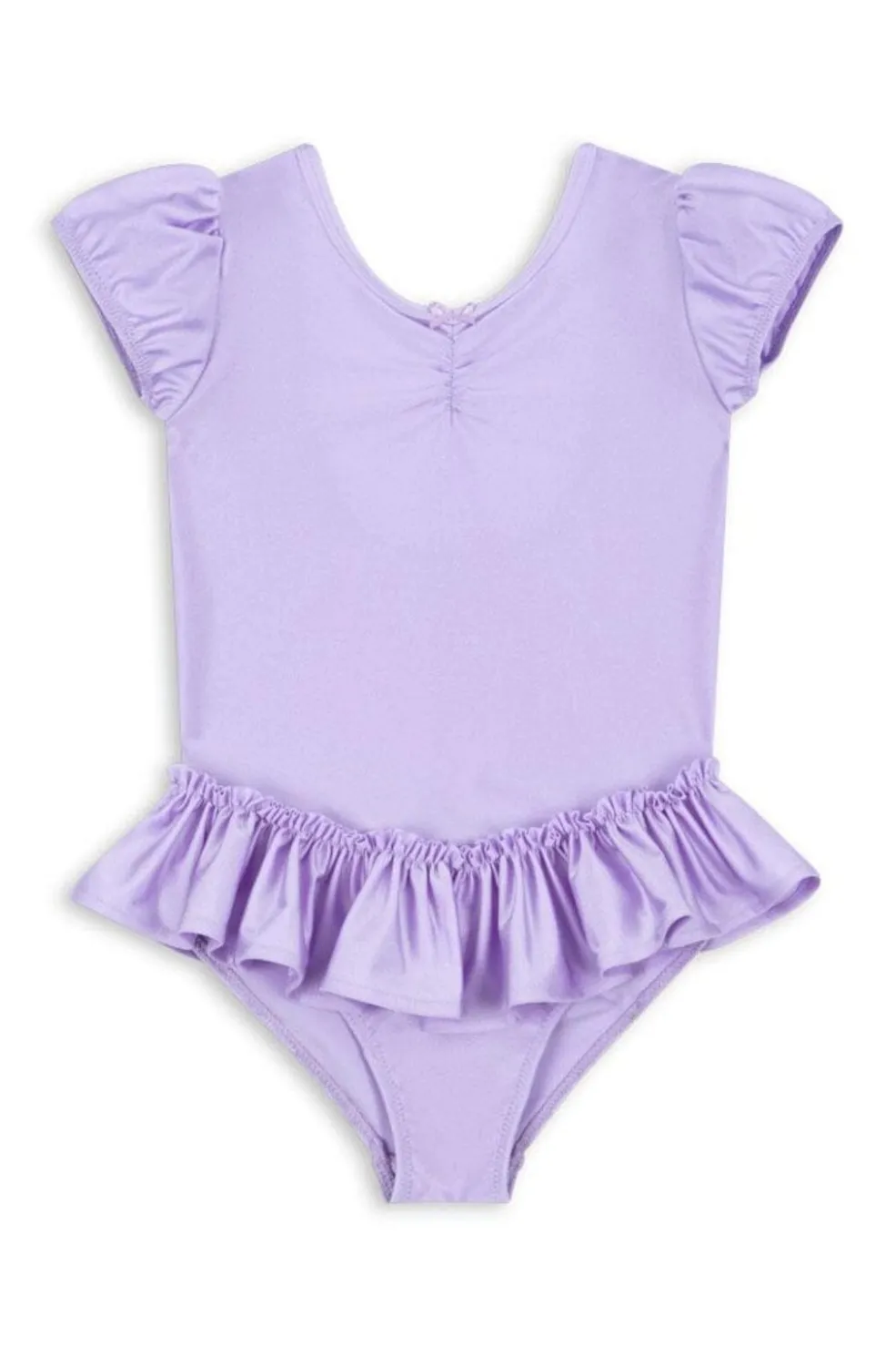 Lavendel lilla tutu-kjole fra Konges Sløjd med tylskørt og flæsekanter. De korte ærmer og den runde hals giver en enkel overdel til den pyntede nederdel.