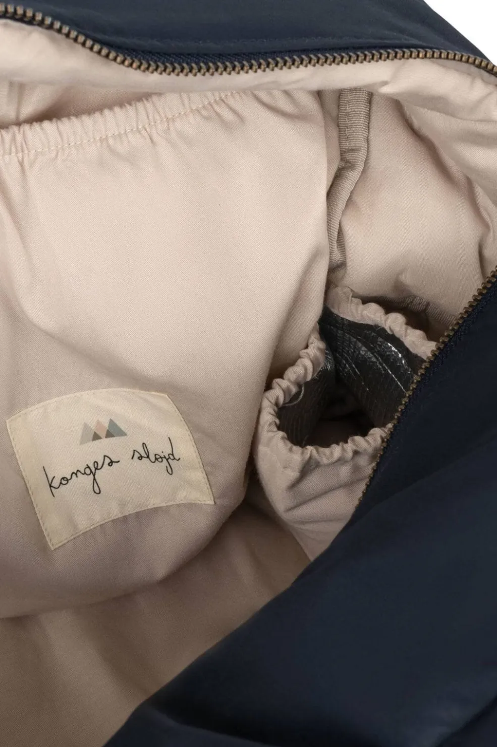 Mørkeblå pusletaske fra Konges Sløjd med aftagelig puslepude og flere rum til organisering af babyudstyr. Tasken har vandafvisende egenskaber og praktiske lukkemekanismer.