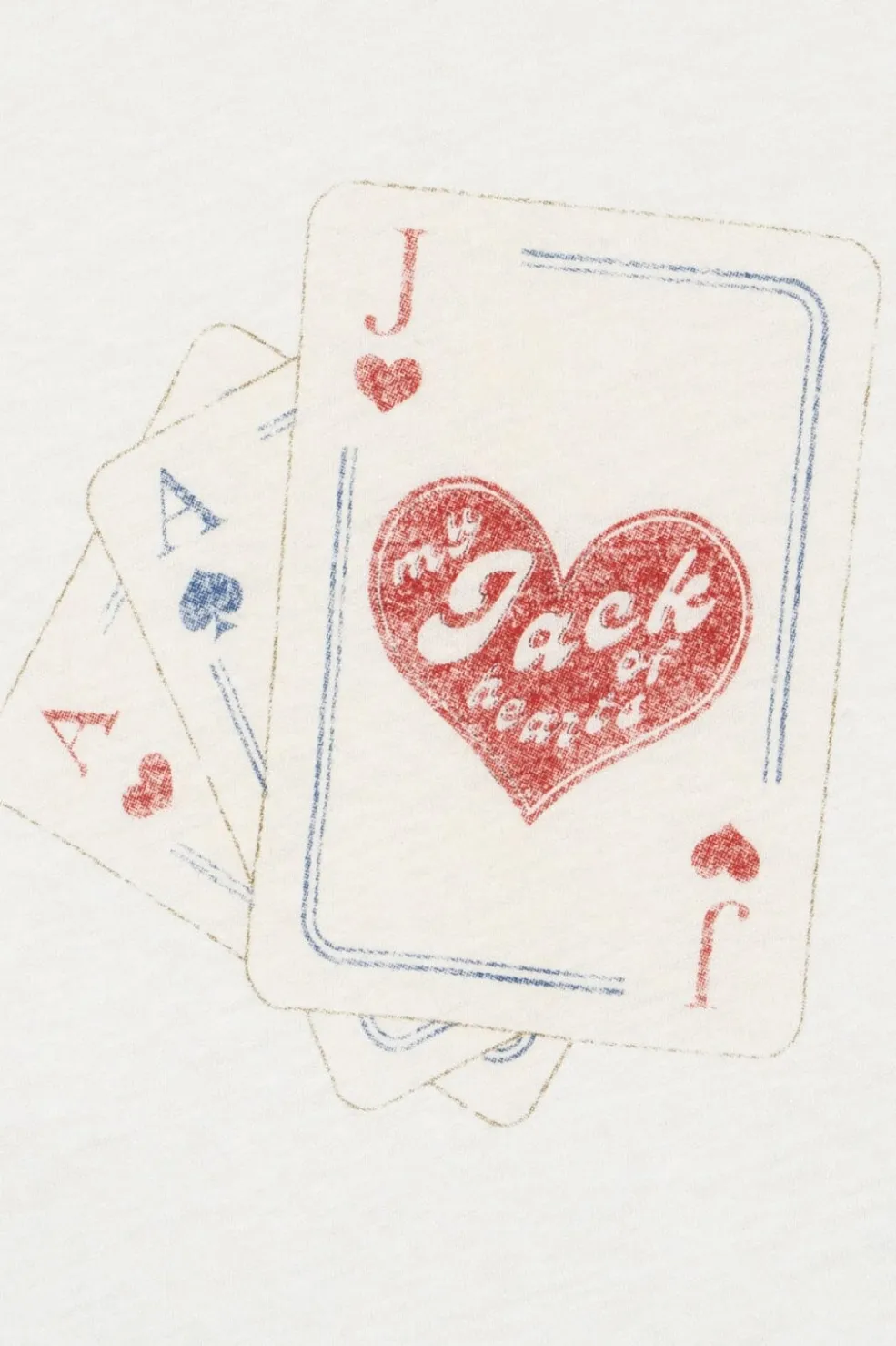 Det grafiske print viser et klassisk spillekortdesign med Jack of Hearts i rød på forsiden. Bagsiden har en håndskrevet tekst med Game On.