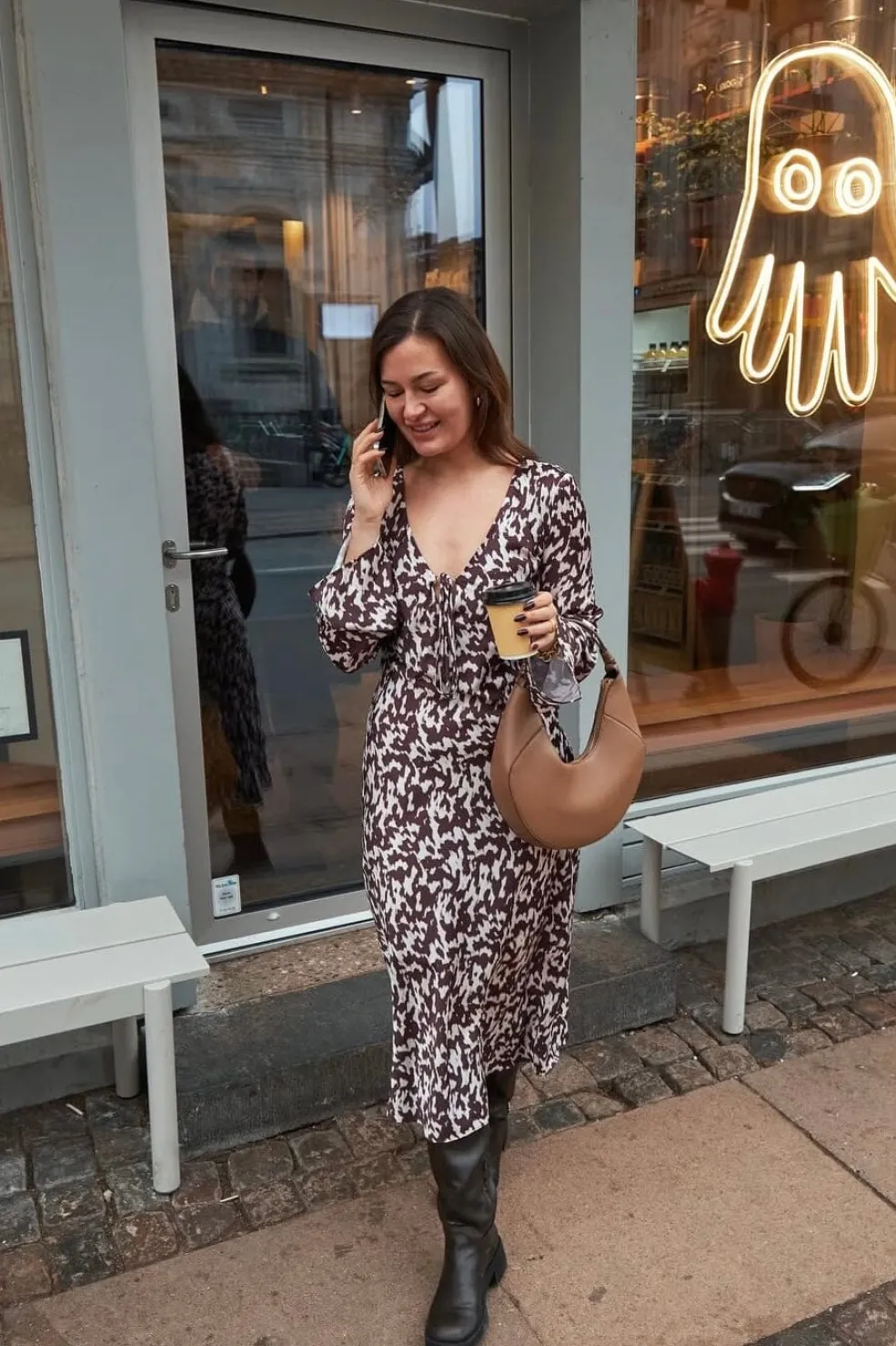 Kjole fra Neo Noir i chokoladebrun med hvidt grafisk mønster. Den har en dyb V-udskæring med bindebånd og lange ærmer med flagrende design. Kjolen når til midt på læggen.