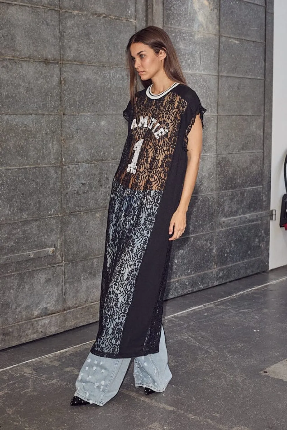 Sort blondekjole fra Haute L’Amitié med pailletter og blomsterprint. Kjolen har korte ærmer med flæser og en rund halsudskæring.