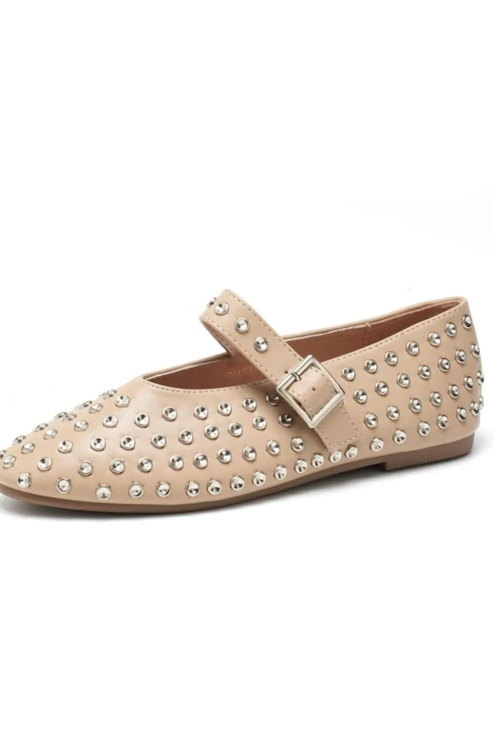 Beige sko fra Marta Du Chateau med sølvfarvede nitter og spændelukning over vristen. Den flade hæl og det enkle design gør skoen praktisk til både formelle og festlige anledninger.