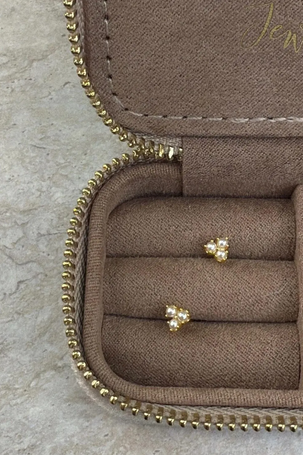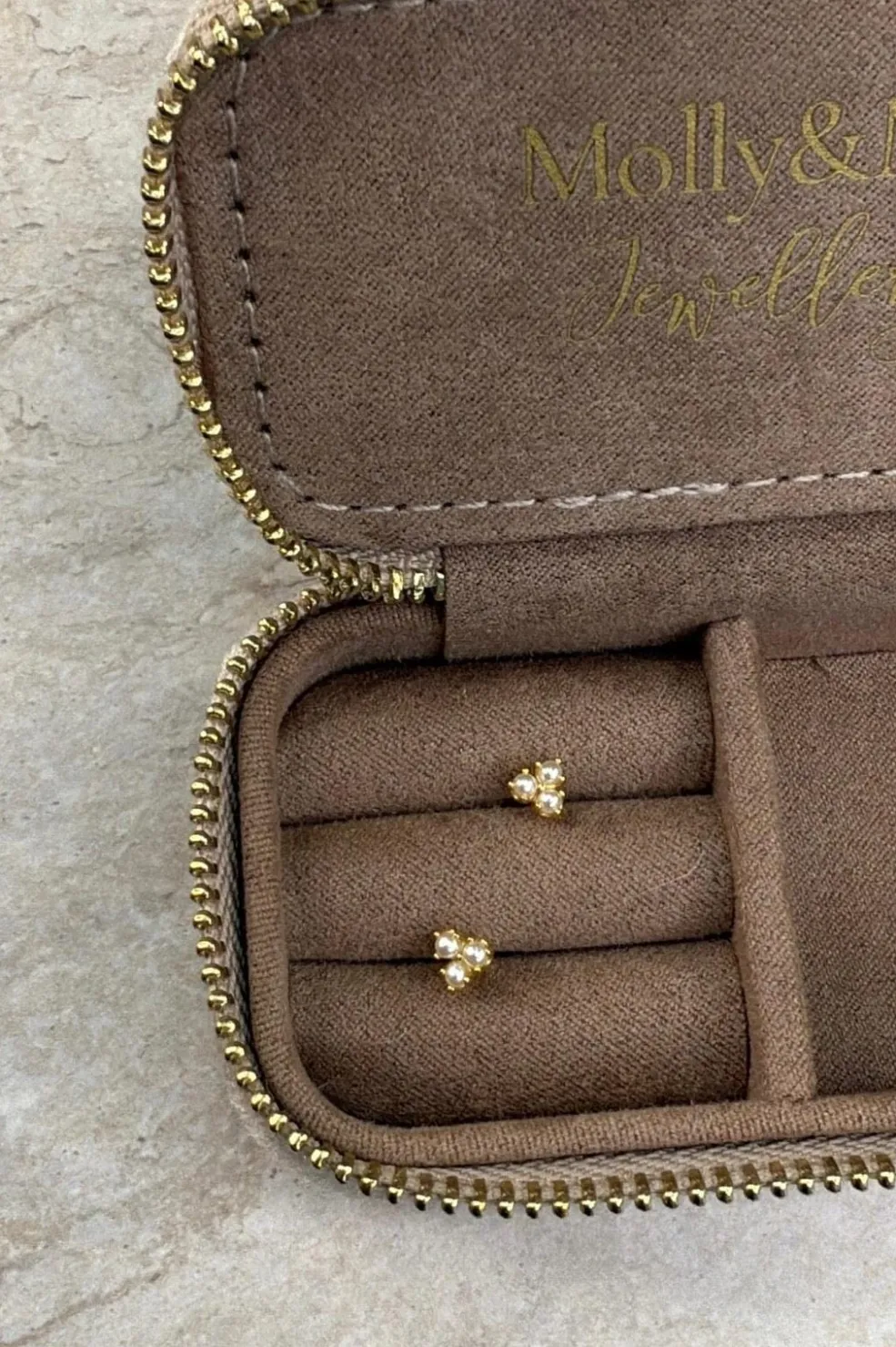 Ørestikker fra Molly&My Jewellery med forgyldt sølv og tre perler på hver stik. Lavet af 925 sterling sølv med en gylden finish.