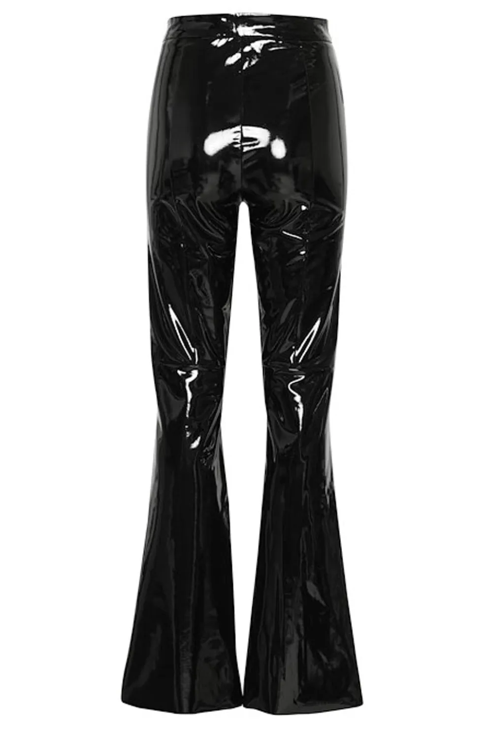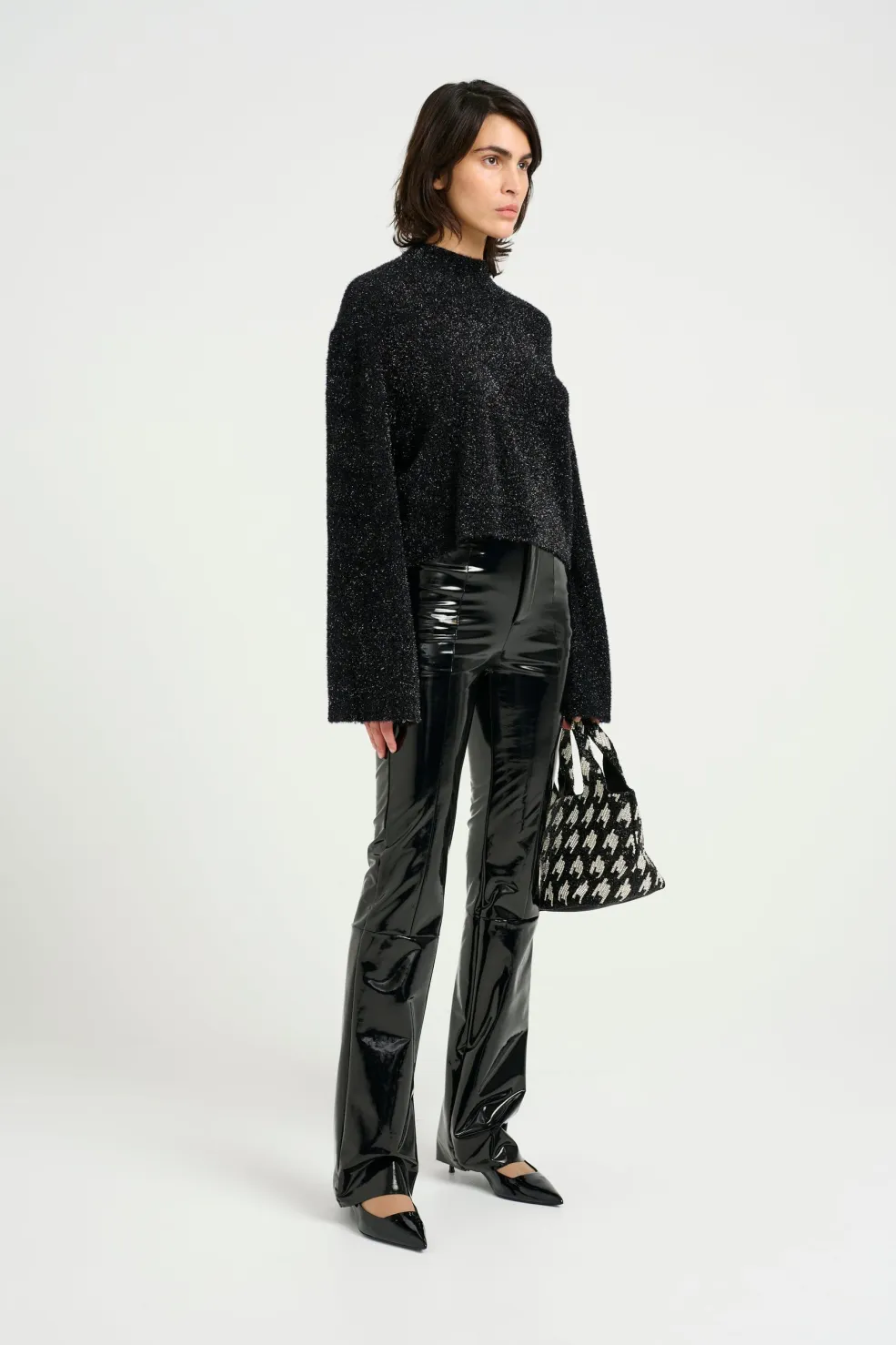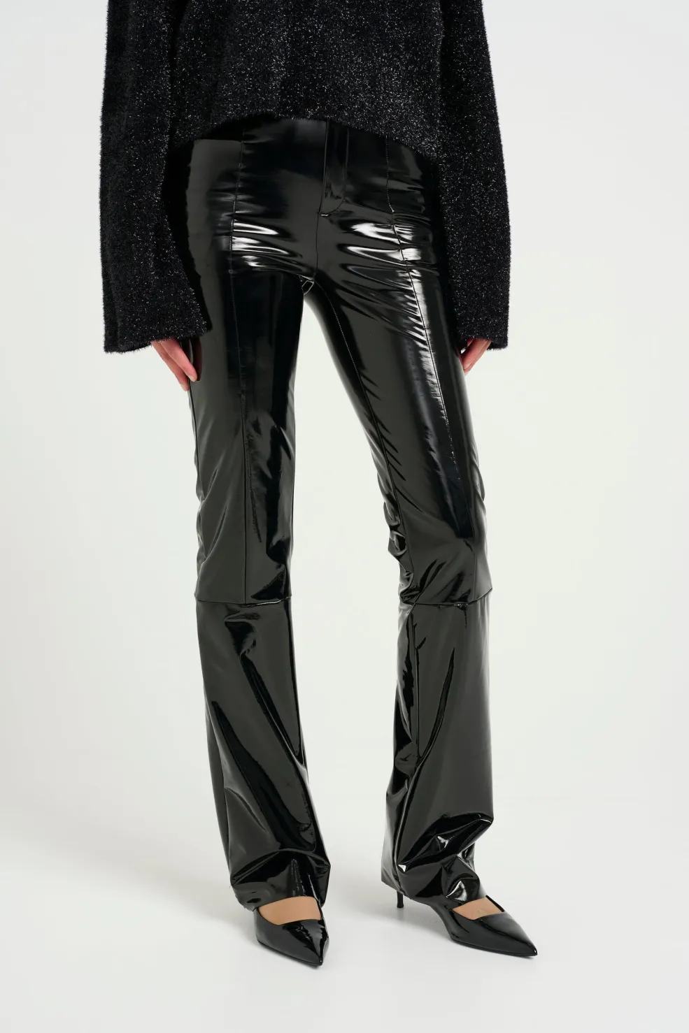 Sorte bukser fra Gestuz med en skinnende overflade. Bukserne har et flared design og en gulvlang længde, som giver en flot silhuet.