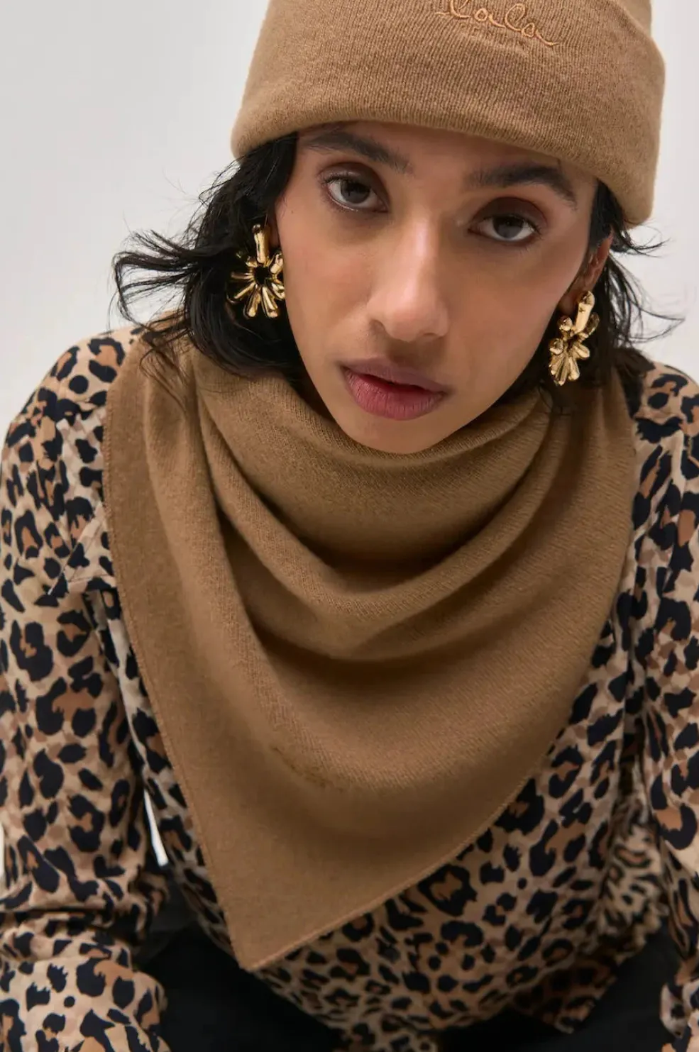 Trekantet tørklæde fra Lala Berlin i en brun jordfarve. Tørklædet er lavet af en blanding af cashmere og har et ensfarvet design.