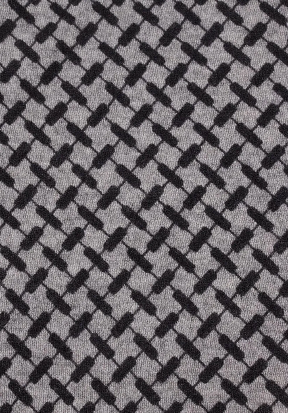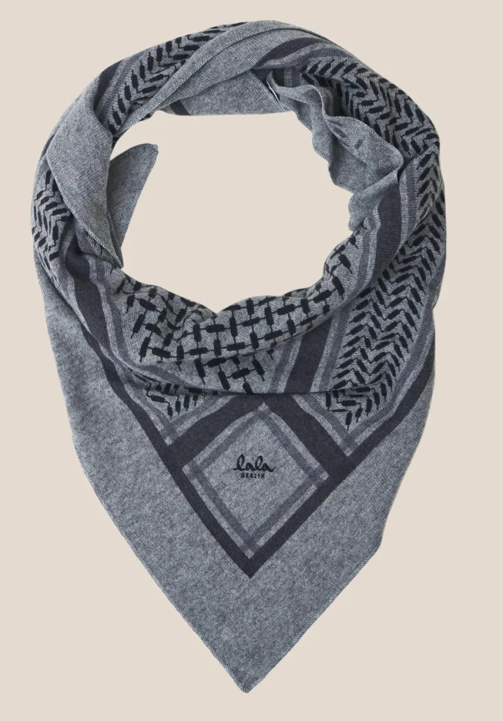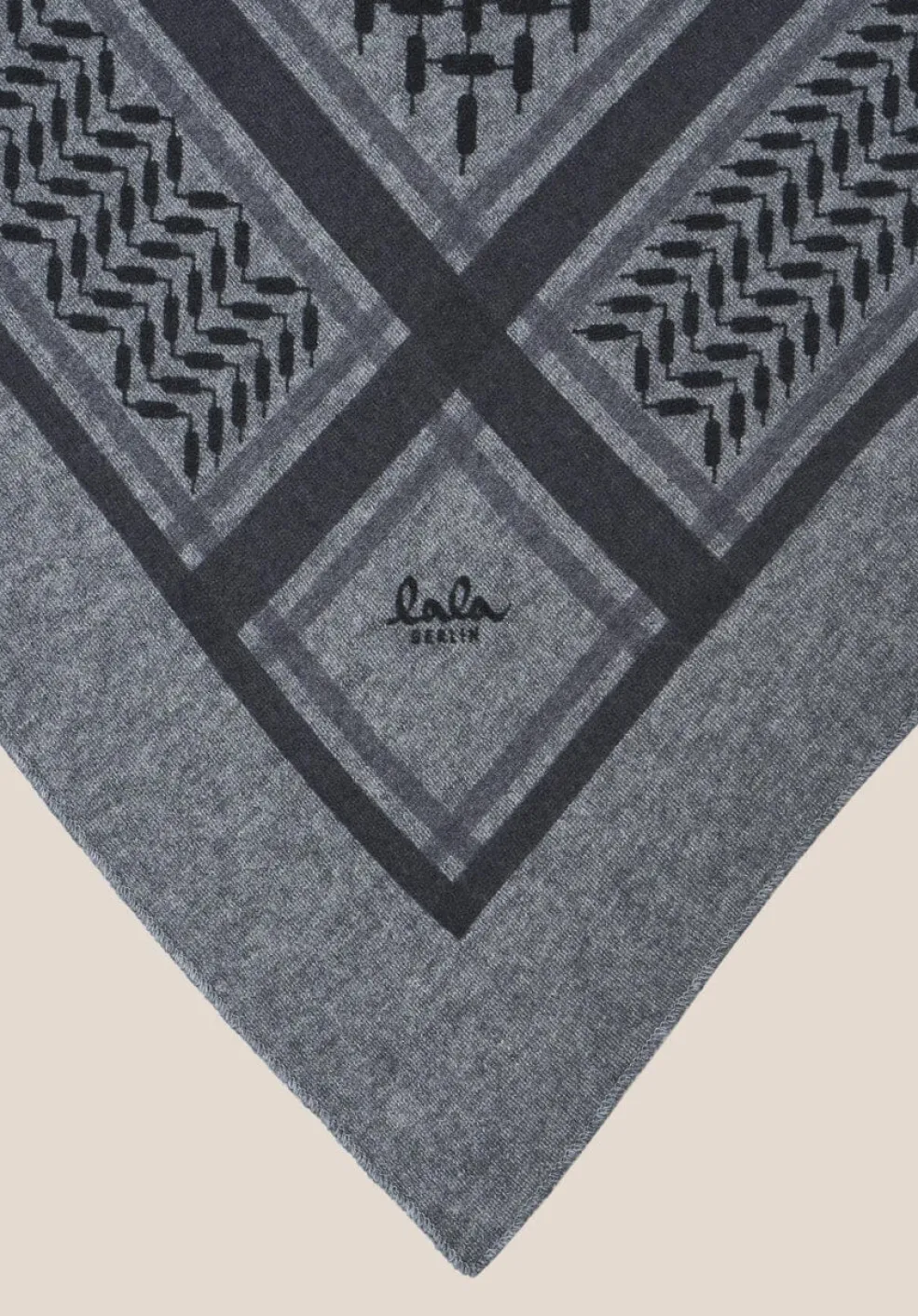 Trekantet tørklæde fra Lala Berlin i melangegrå med sort Kufiya-mønster. Tørklædet har geometriske detaljer og en karakteristisk trekantet form.