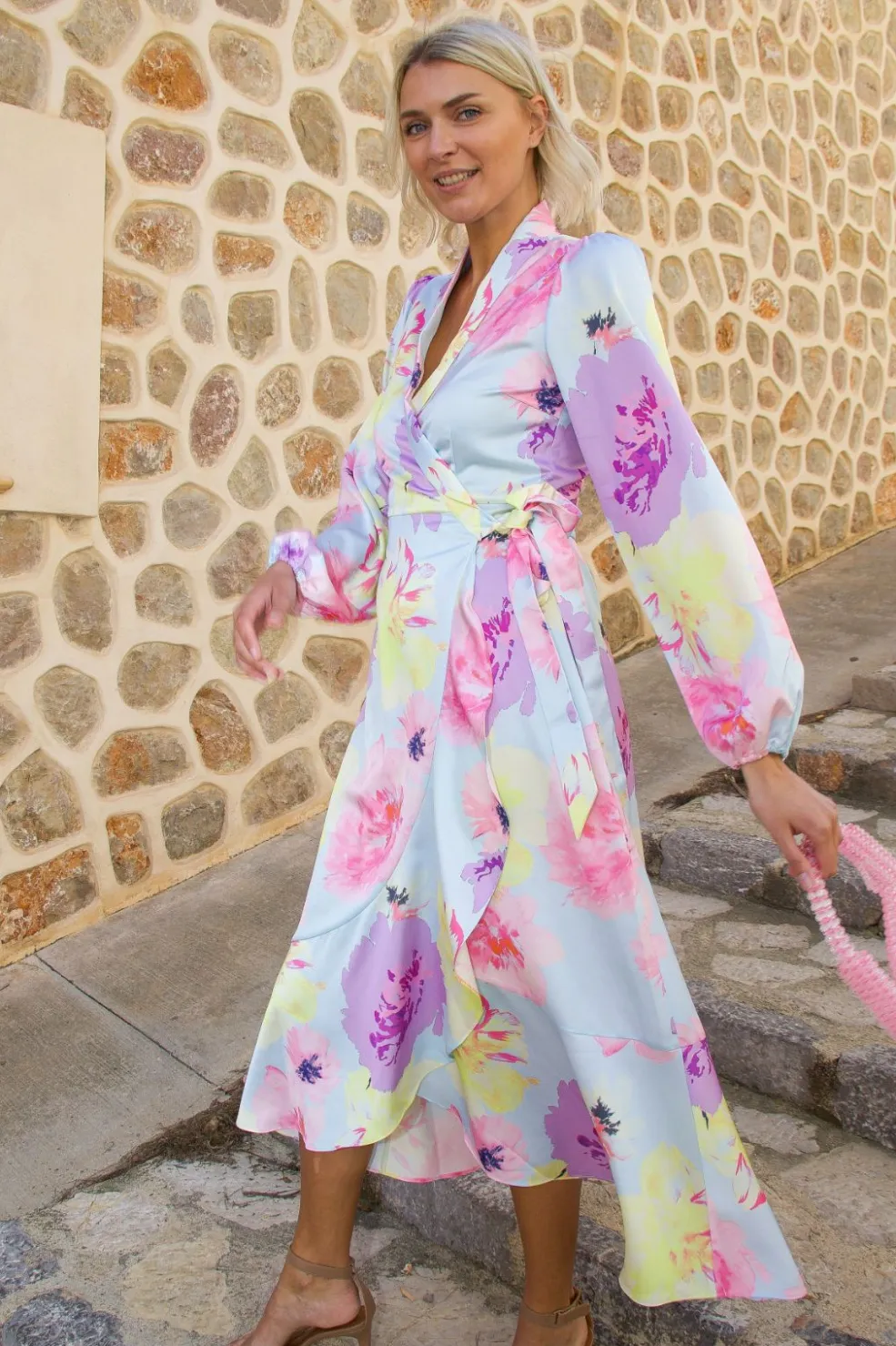 Lang slå-om-kjole fra Cras med blomstermønster i lyseblå, pink og gule nuancer. Kjolen har flæsedetaljer nederst og lange ærmer med elastik ved håndleddene.