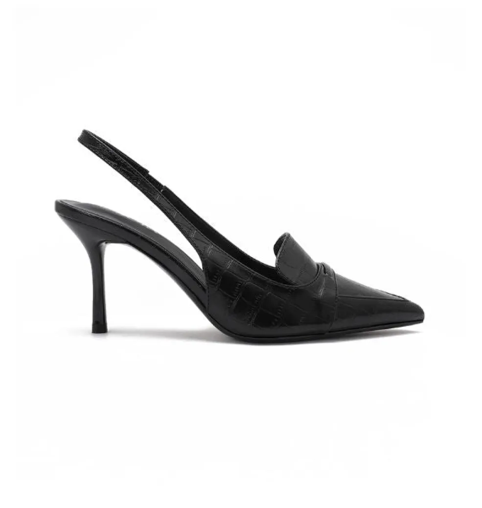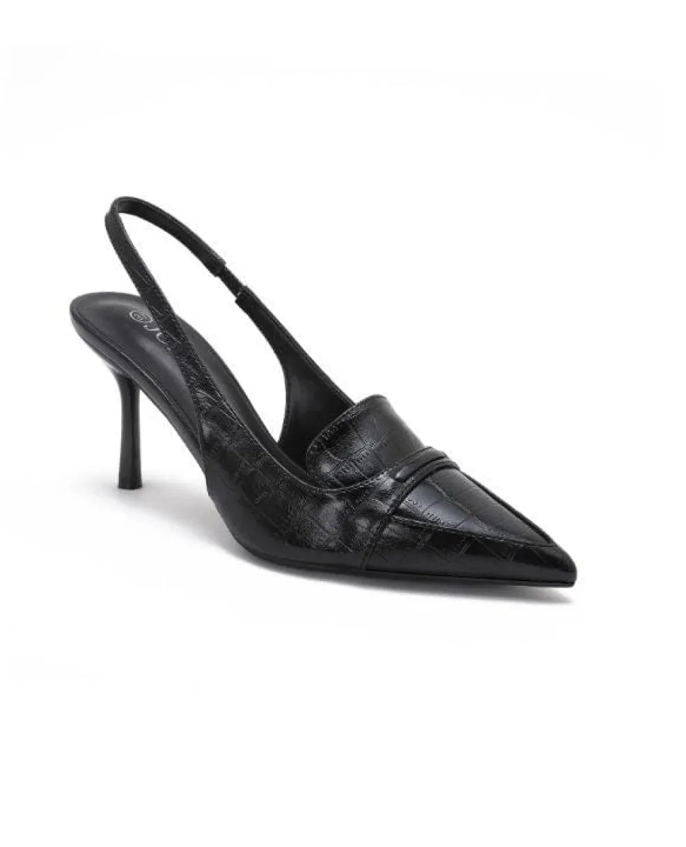 Sorte stiletter fra Bloom, lavet af P. U.-materiale. Skoene har en slank stilethæl og en spids tå med dekorativt bånd.