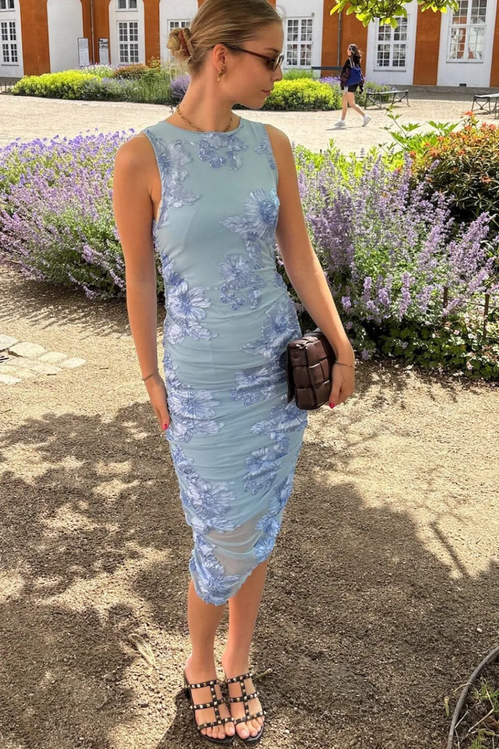 Blå kjole fra Noella med blomsterbroderi i Ocean Spray-farven. Den tætsiddende kjole har høj halsudskæring og går til knæene.