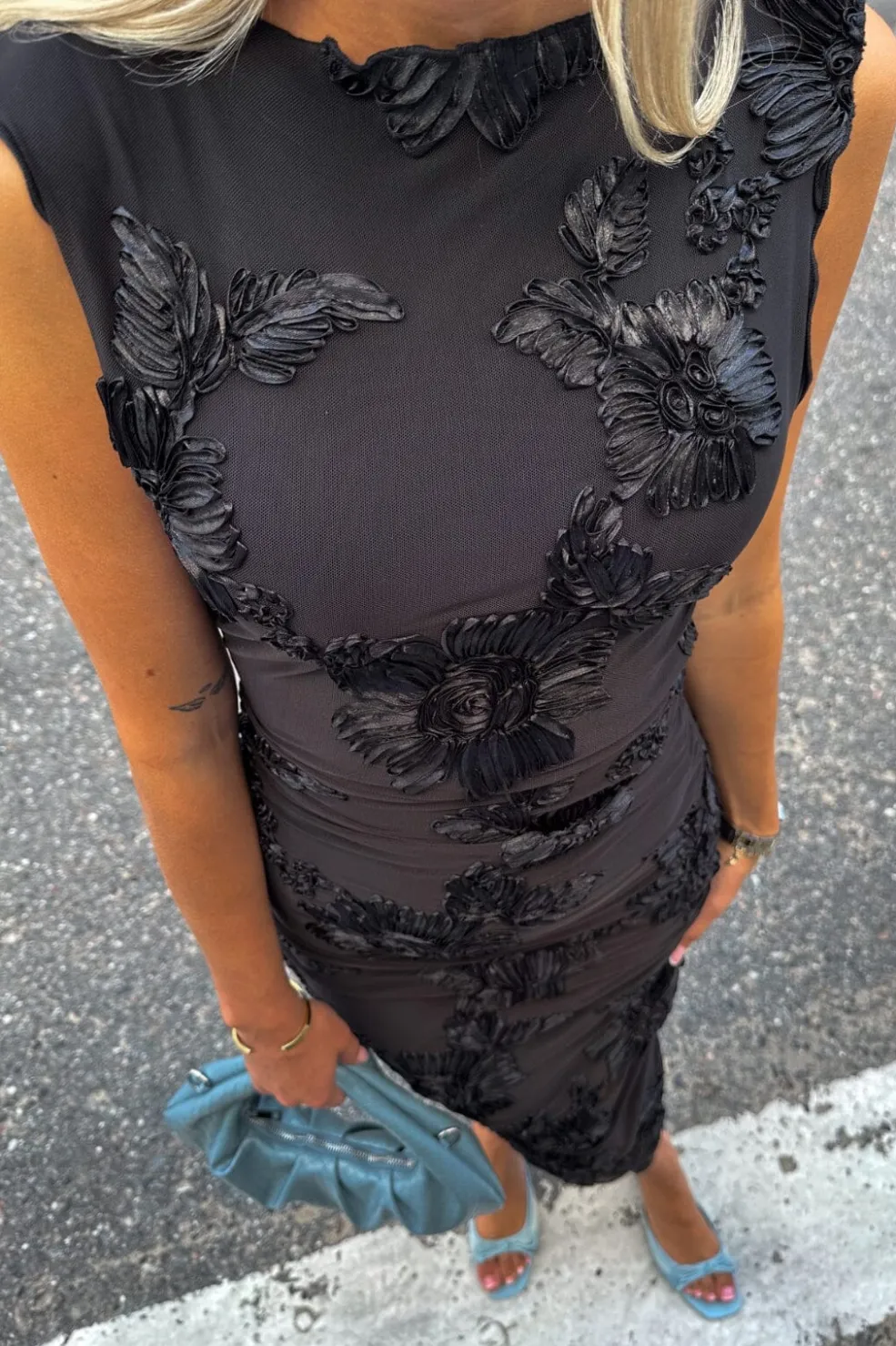 Sort kjole fra Noella med broderede blomster. Kjolen har en tætsiddende pasform og går til midt på læggen. Den runde halsudskæring og det ærmeløse design giver et rent udtryk.