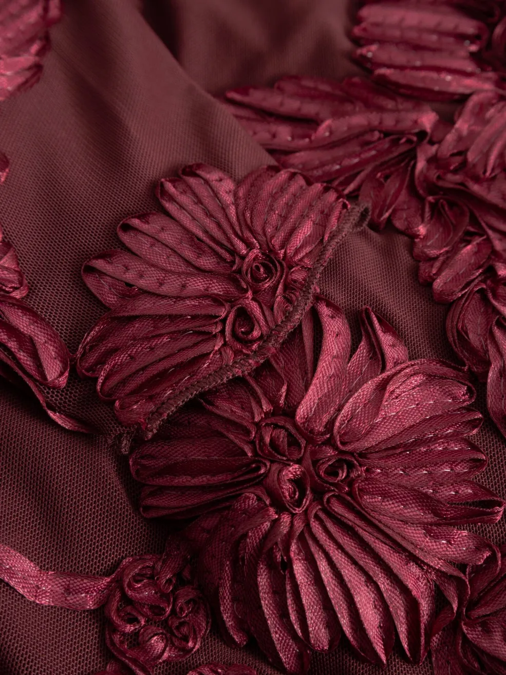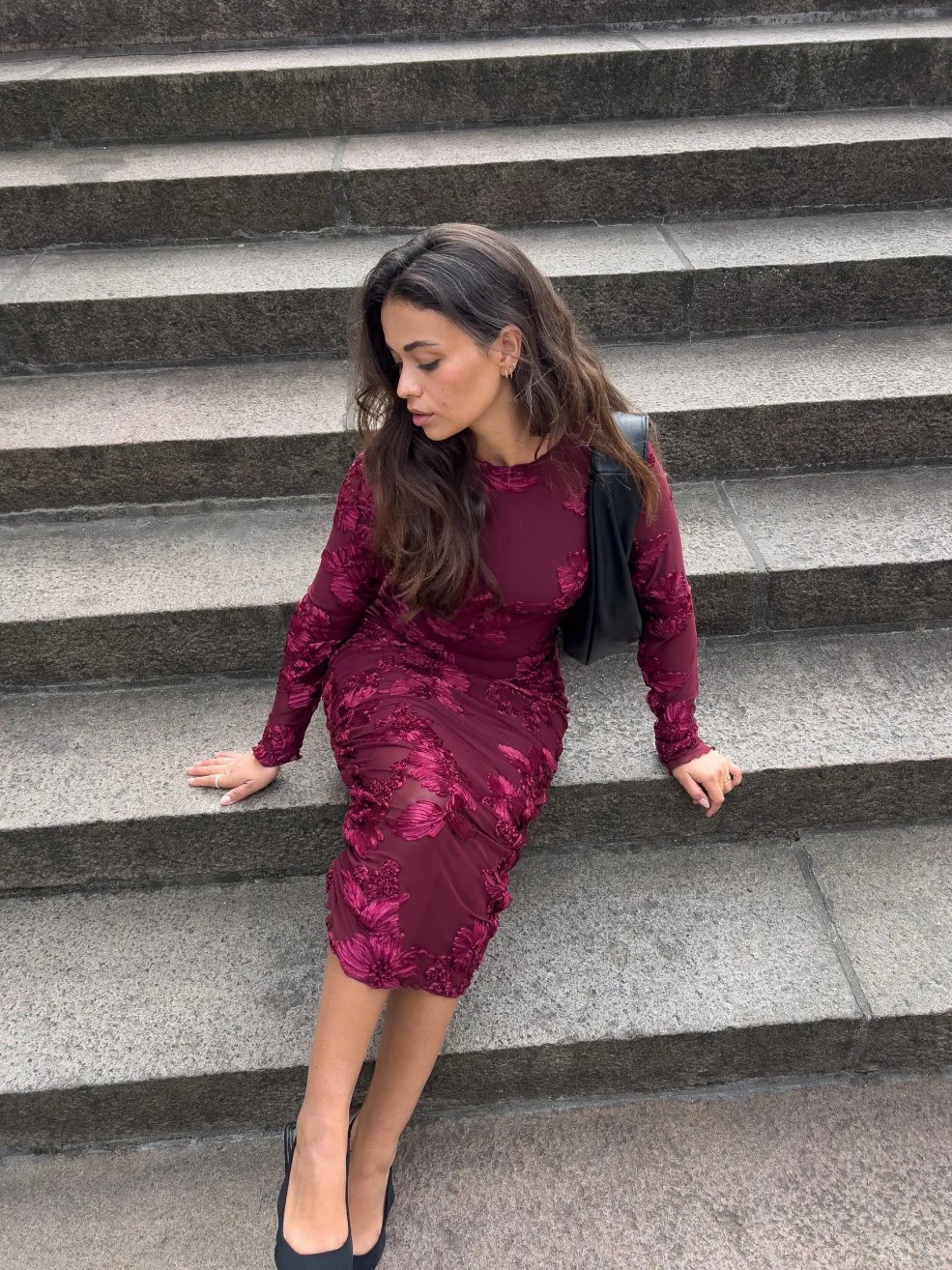 Vinrød kjole fra Noella med blomsterbroderi. Kjolen har lange ærmer og en tætsiddende pasform i strækbart meshstof med rynkede detaljer i siderne.