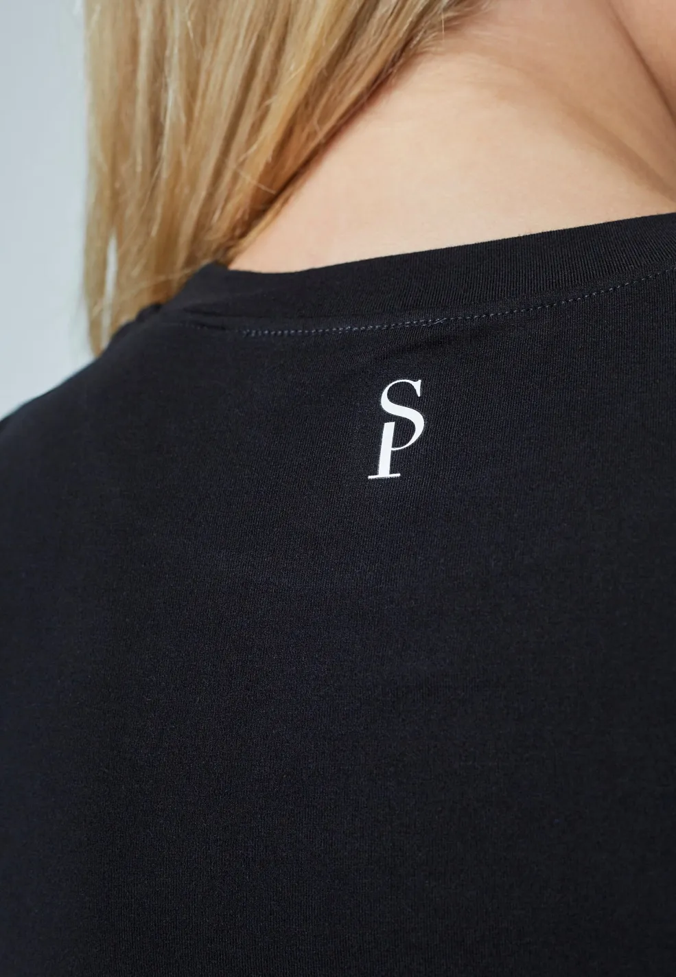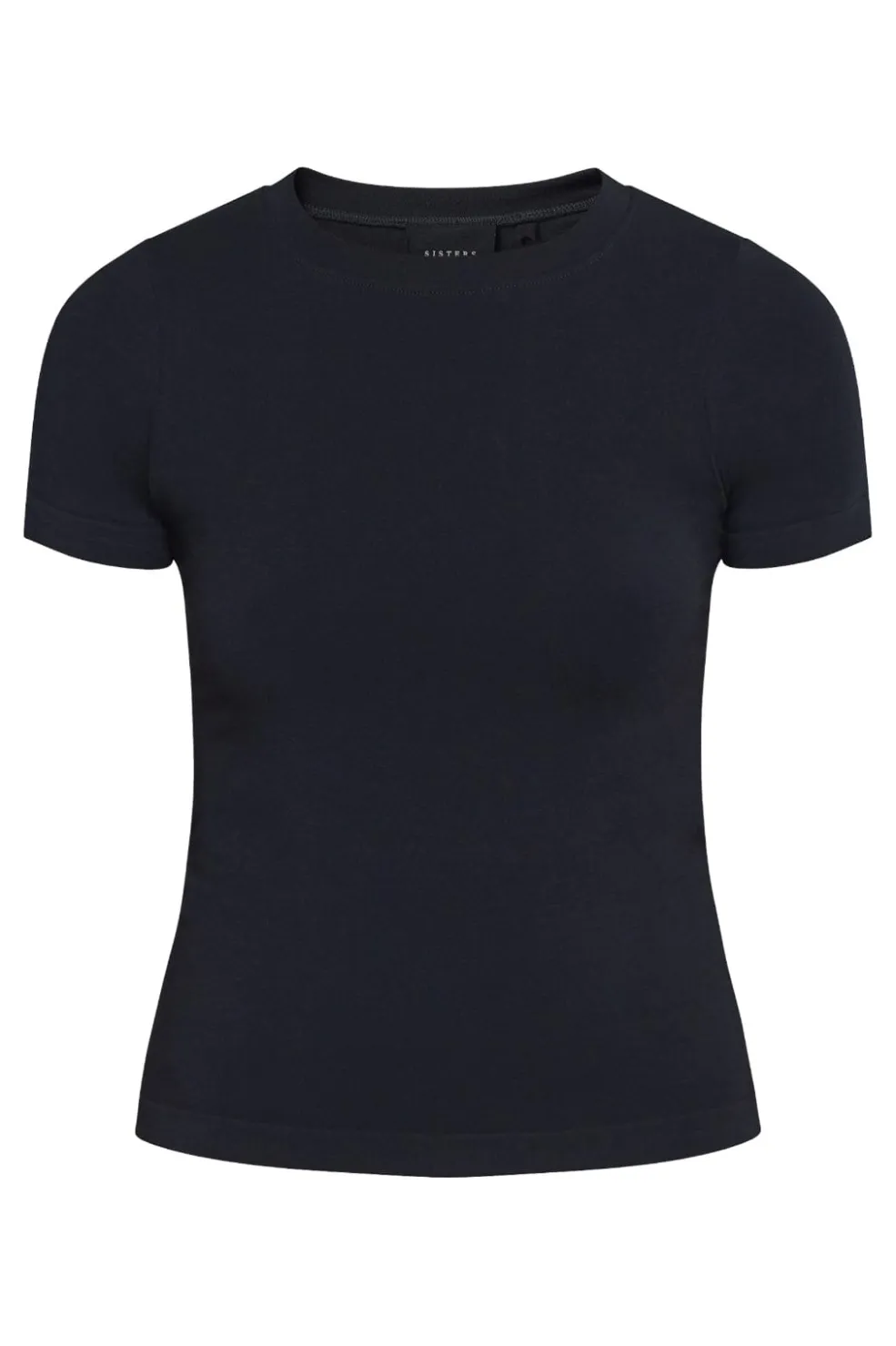 Sort T-shirt fra Sisters Point med tætsiddende pasform, korte ærmer og rund halsudskæring. Den har et lille SP-logo broderet på ryggen.