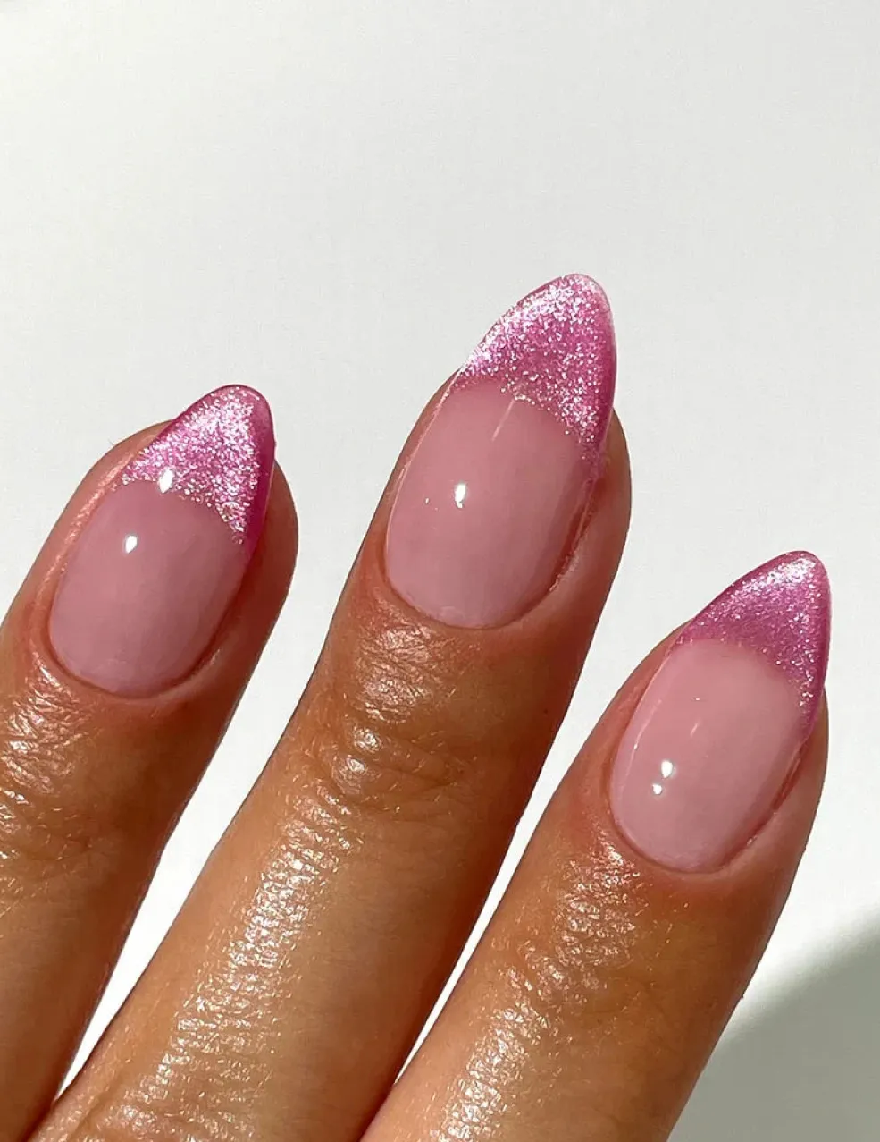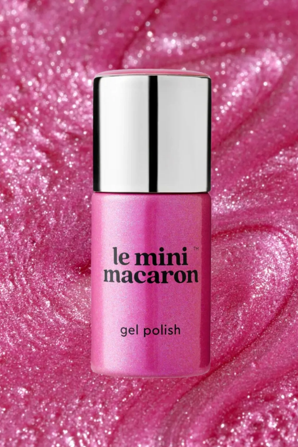 Gelpolish fra Le Mini Macaron i den lyserøde nuance Cosmopolitan Velvet med fine glimmerpartikler, der giver en skinnende finish.