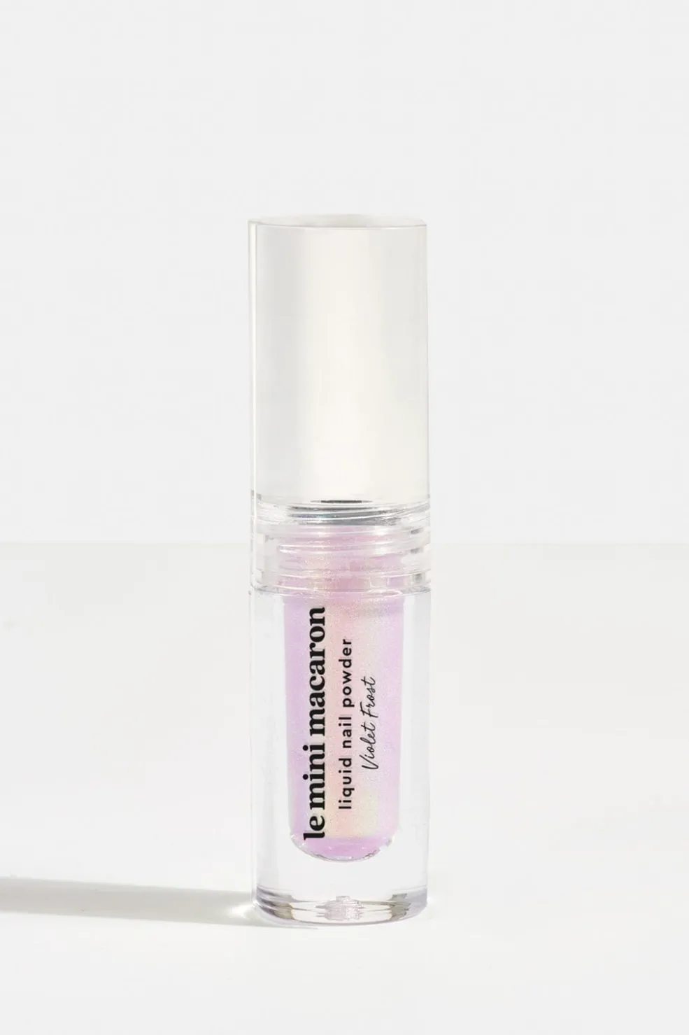 Et neglepulver fra Le Mini Macaron i farven Violet Frost. Pulveret skaber en glansfuld overflade med fine glitterpartikler på neglene.