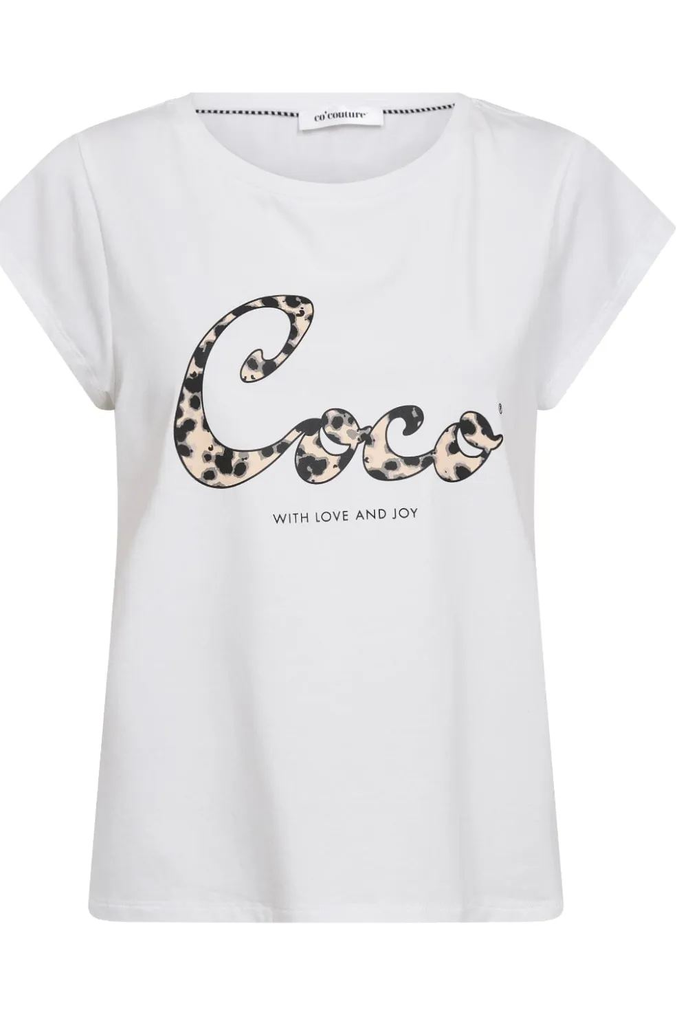 Hvid t-shirt fra Co’couture med leopardmønstret Coco-tekst på fronten. T-shirten har en rund halsudskæring og korte ærmer.