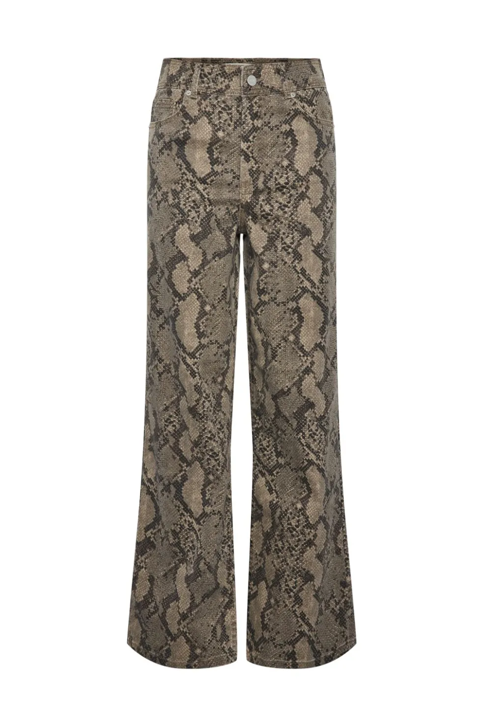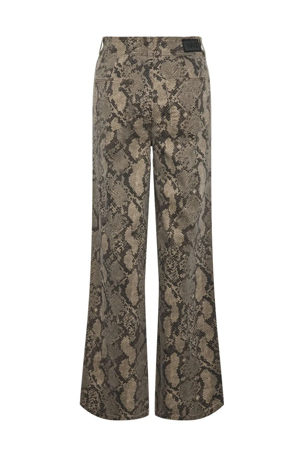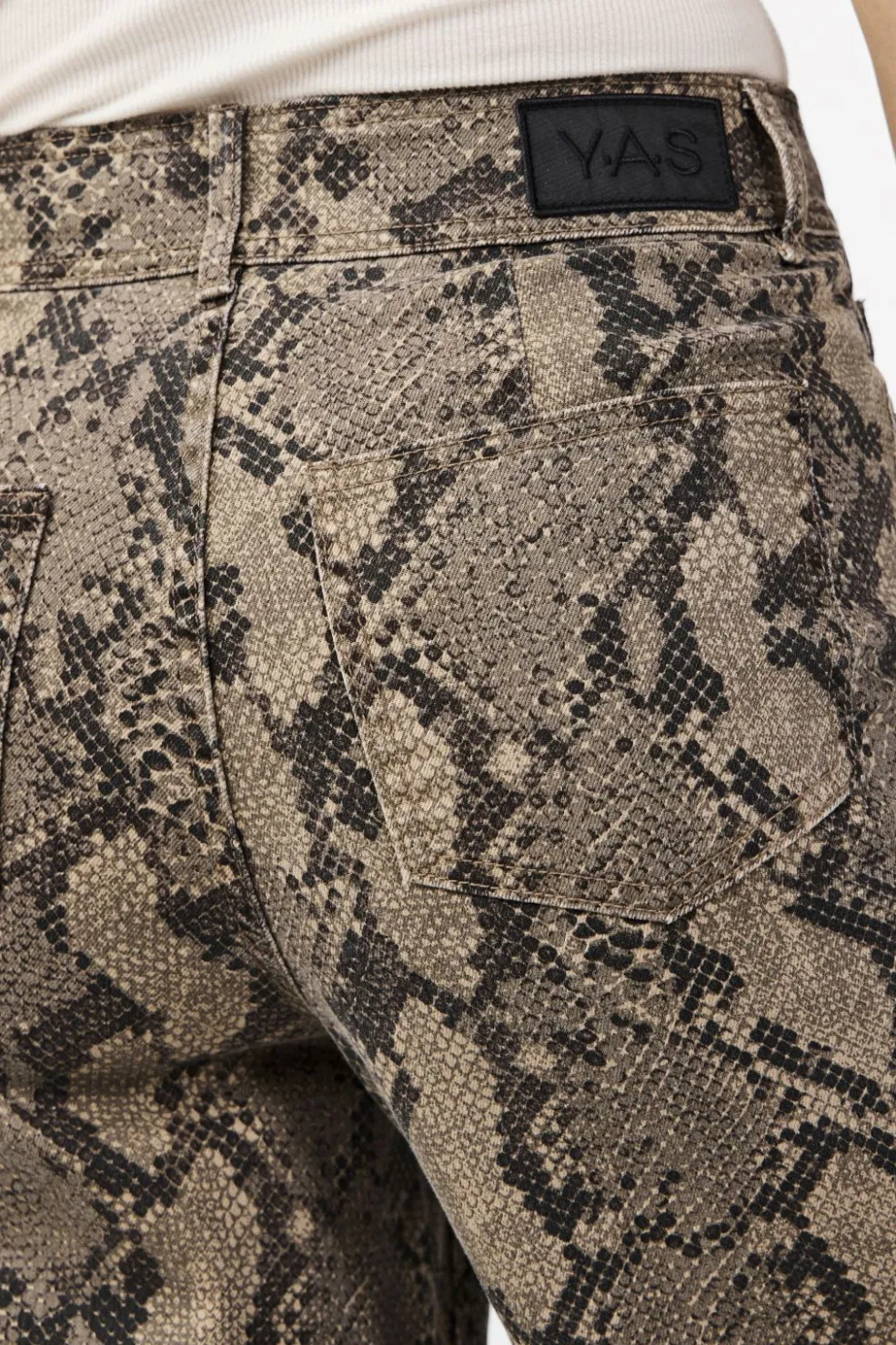 Denimjeans fra Y. A.S med slangeskindsprint i brune og beige nuancer på sort baggrund. Den høje talje og regular fit giver en klassisk pasform.