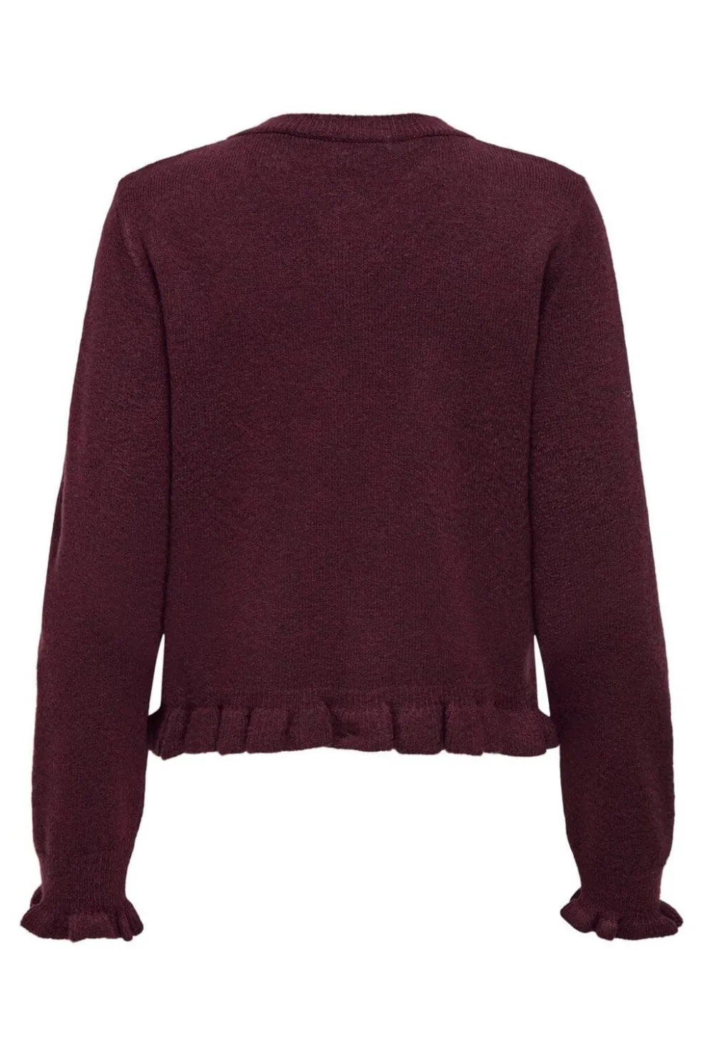 Vinrød cardigan fra JDY i meleret strik med flæsedetaljer. Den har rund hals, lange ærmer og knapper hele vejen ned.