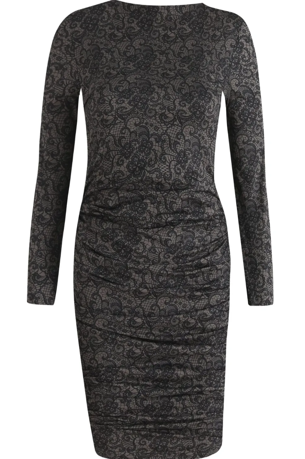 Sort og grå blondekjole fra Liberte med rynkeeffekt. Kjolen har en tætsiddende silhuet med lange ærmer og rund hals. Det gennemgående blondemønster giver kjolen et diskret udtryk.