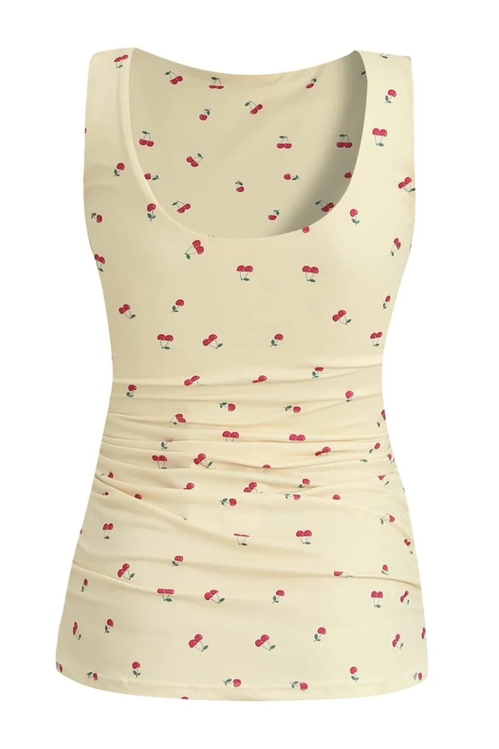 Ærmeløs top fra Liberte med lys gul baggrund og kirsebærprint. Toppen har en rund halsudskæring, bindebånd i siderne og flæsedetaljer.