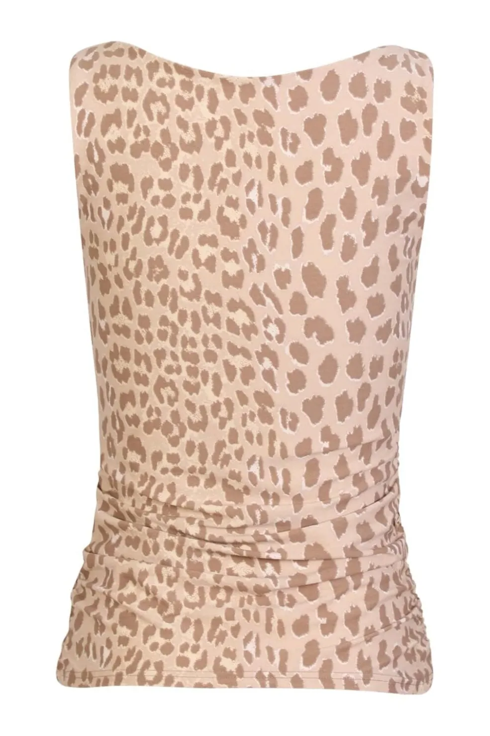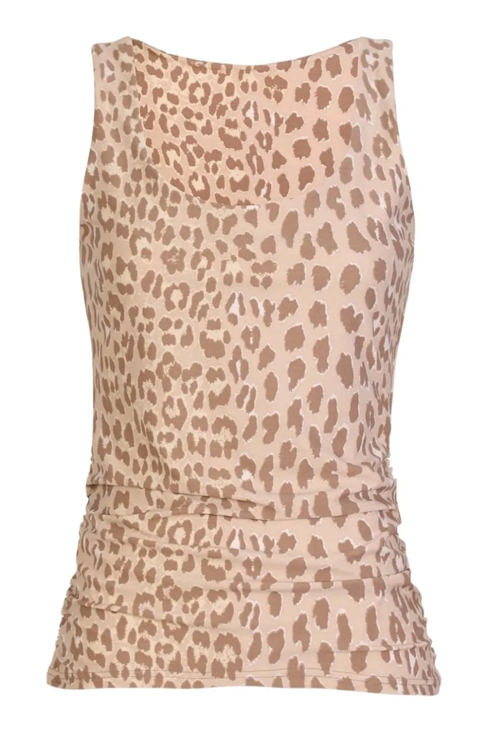 Tanktop fra Liberte i brun og beige med leopardprint. Toppen har en rynket detalje i stoffet, der giver den struktur og form.
