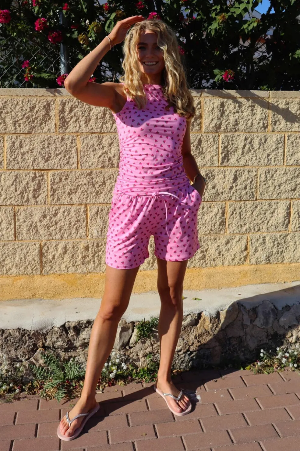 Ærmeløs top fra Liberte i pink med vandmelonprint. Toppen har en høj hals og slim fit-pasform med rynket design og flæsedetaljer.