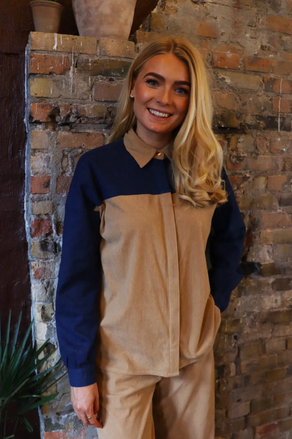 Fløjlsjakke fra Liberte med tofarvet design i mørkeblå og beige. Jakken har en loose fit-pasform og er lavet af fløjlstof med ribbet struktur.