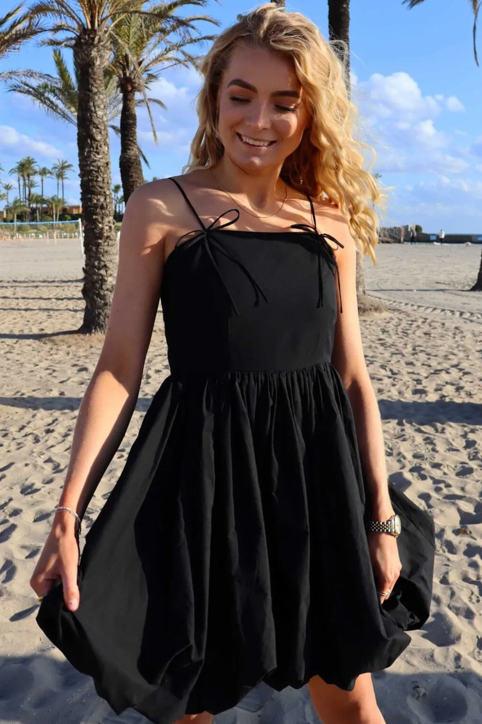 Sort sommerkjole fra Liberte med tynde stropper og samlet nederdel. A-line-silhuetten giver kjolen en fin bevægelse, og bomuldsmaterialet er let og luftigt.
