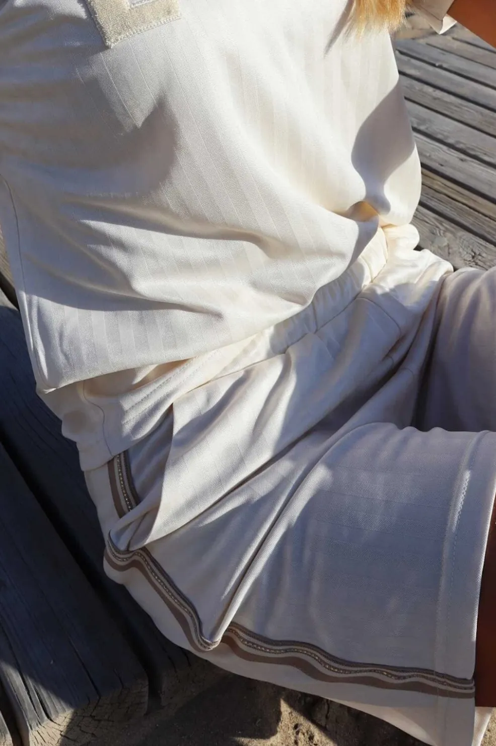 Shorts fra Liberte i cremefarvet nuance med striber. Designet med pailletter og flæser som detaljer. Shortsene har en elastisk talje og et maritimt udtryk.