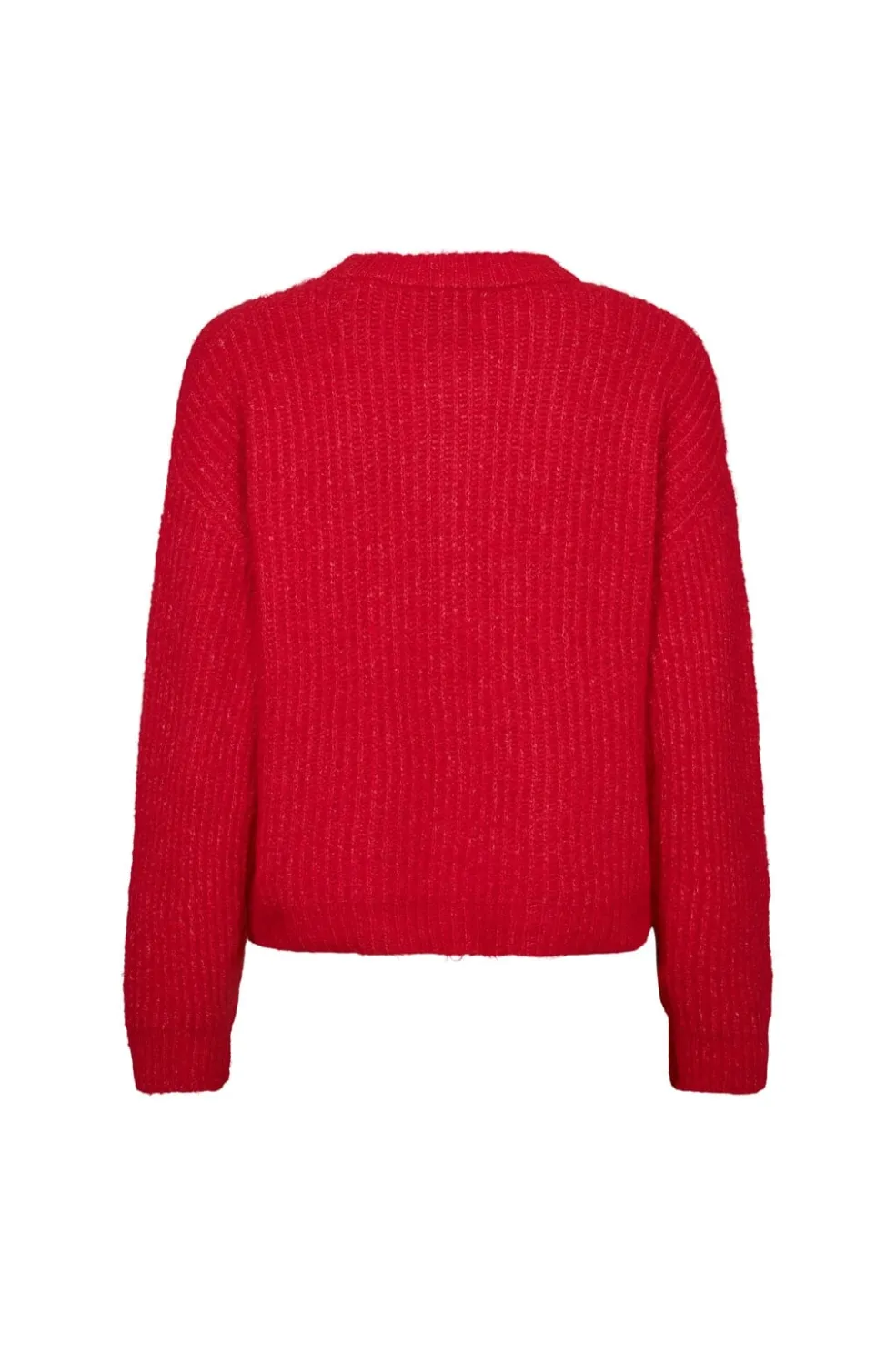 Rød cardigan fra Liberte med ribstrikket tekstur. Den har rund halsudskæring, lange ærmer og knaplukning foran.