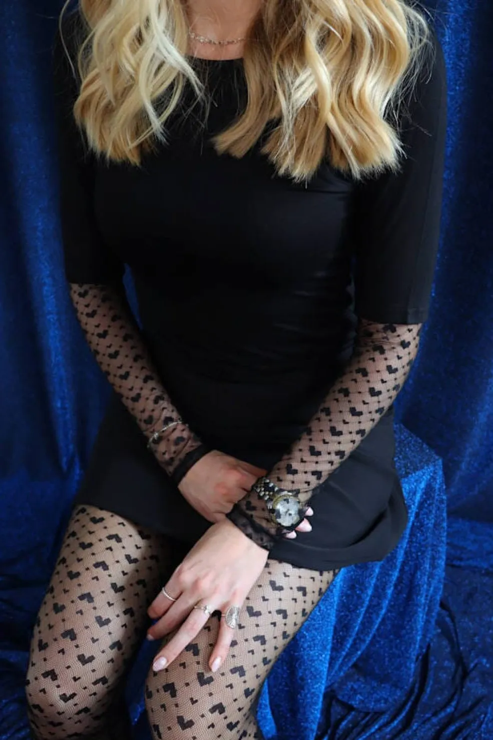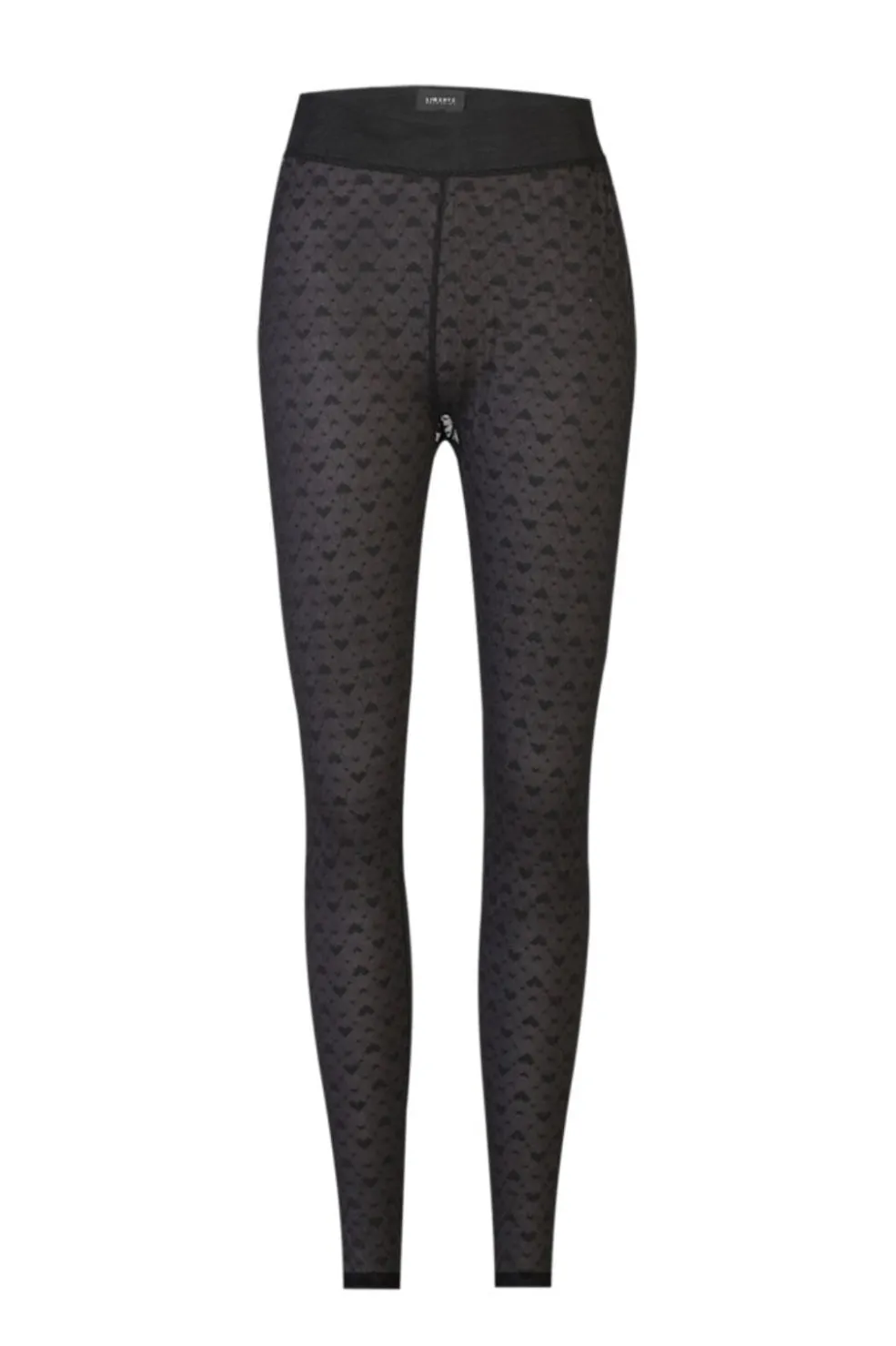Sorte leggings fra Liberte med et gennemgående mønster af små hjerter. De passer til både festlige og afslappede lejligheder.