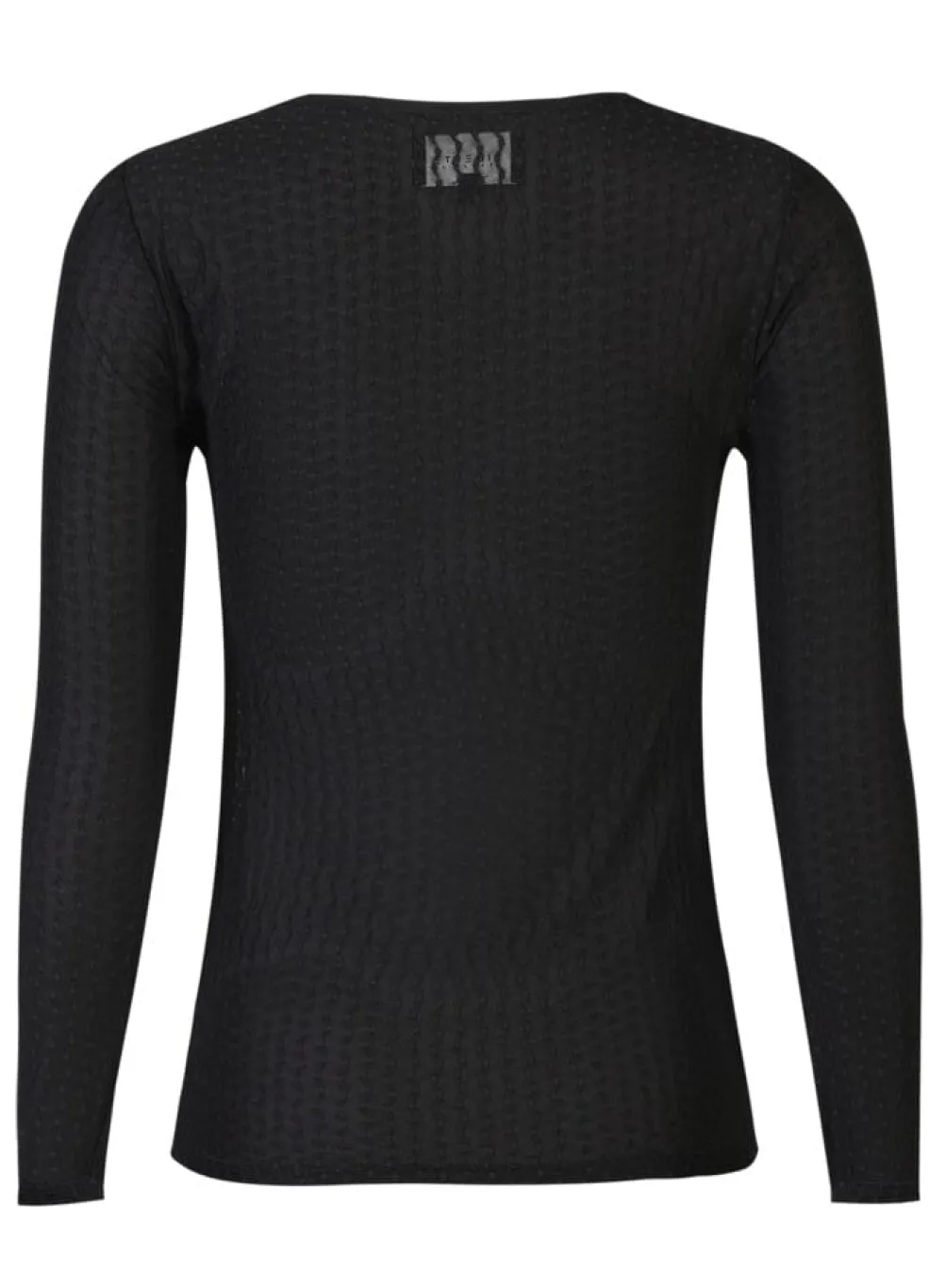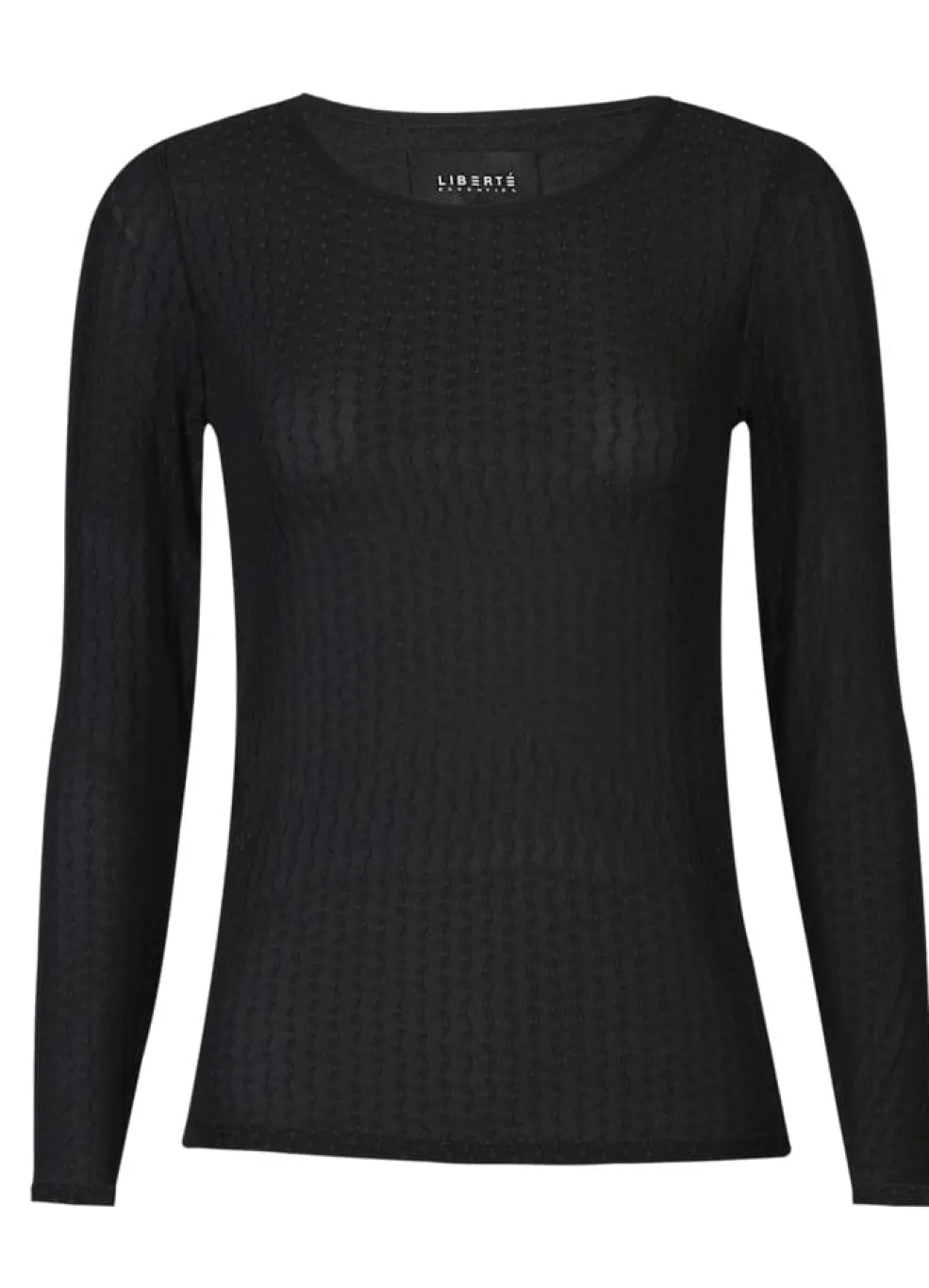 Sort blondebluse fra Liberte med bølgede linjer i gennemsigtigt stof. Blusen har lange ærmer og en slim fit-pasform med rund halsudskæring.