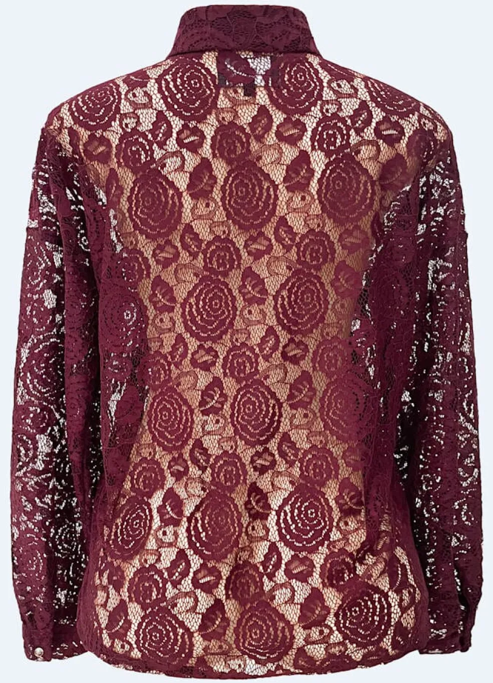 Bordeauxfarvet blondeskjorte fra Liberte med et gennemgående blondemønster. Skjorten har klassisk krave og knaplukning og passer til formelle og festlige lejligheder.