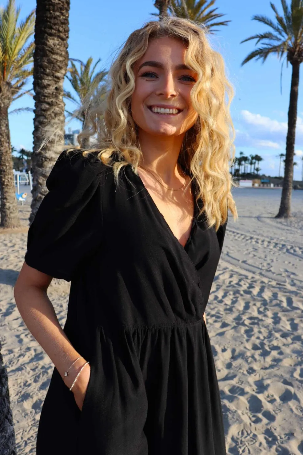 Sort kjole fra Liberte med V-halsudskæring og puffede ærmer. Kjolen har en blød kvalitet og et løst fald, der giver god bevægelsesfrihed.