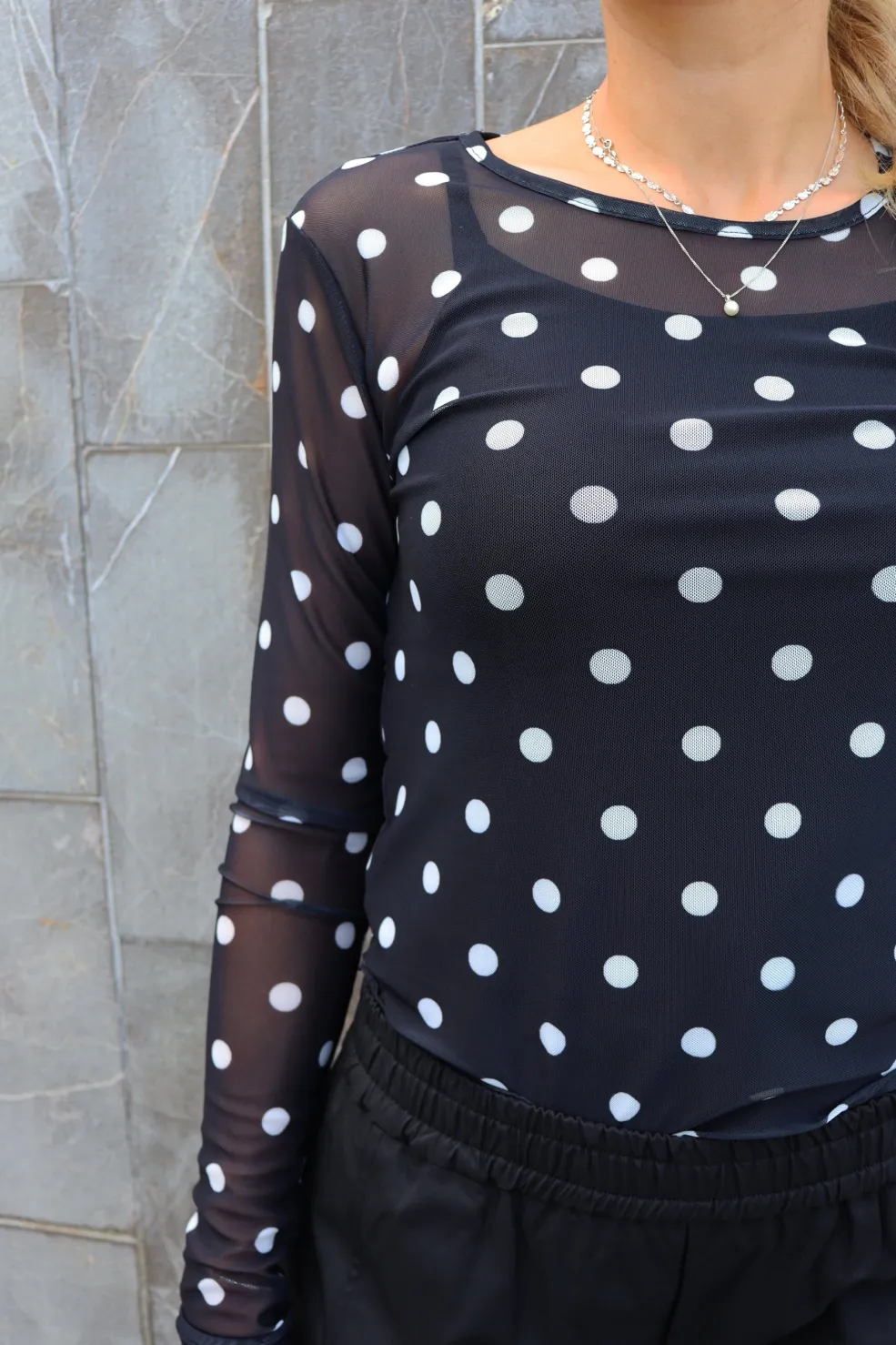 Mesh t-shirt fra Liberte i sort med hvide polka dots. T-shirten har lange ærmer og en tætsiddende pasform.