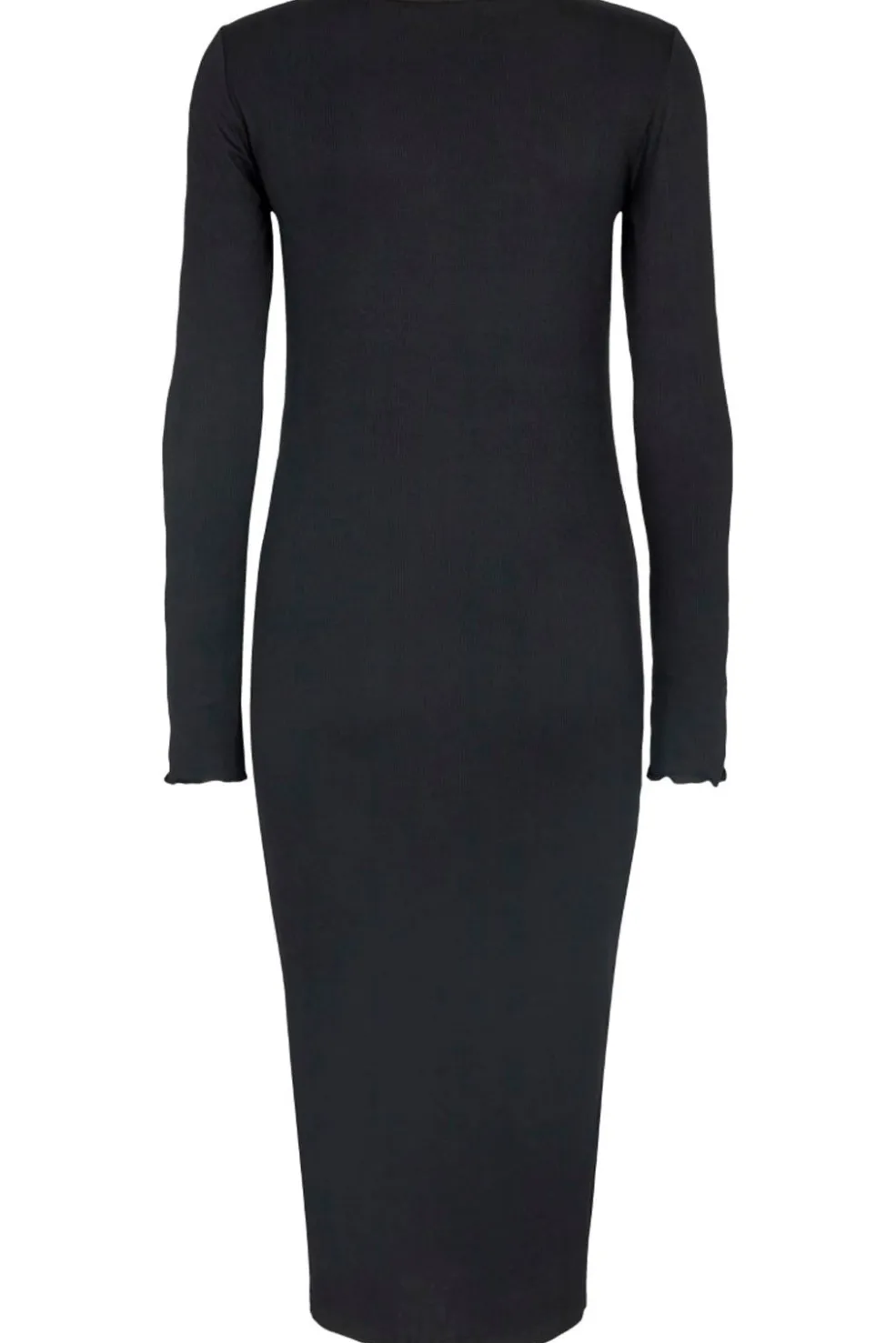 Sort kjole fra Liberte med ribbet tekstur og tætsiddende snit. Kjolen har lange ærmer med flæsekant og rund halsudskæring. Den kalvelange model giver god bevægelsesfrihed.