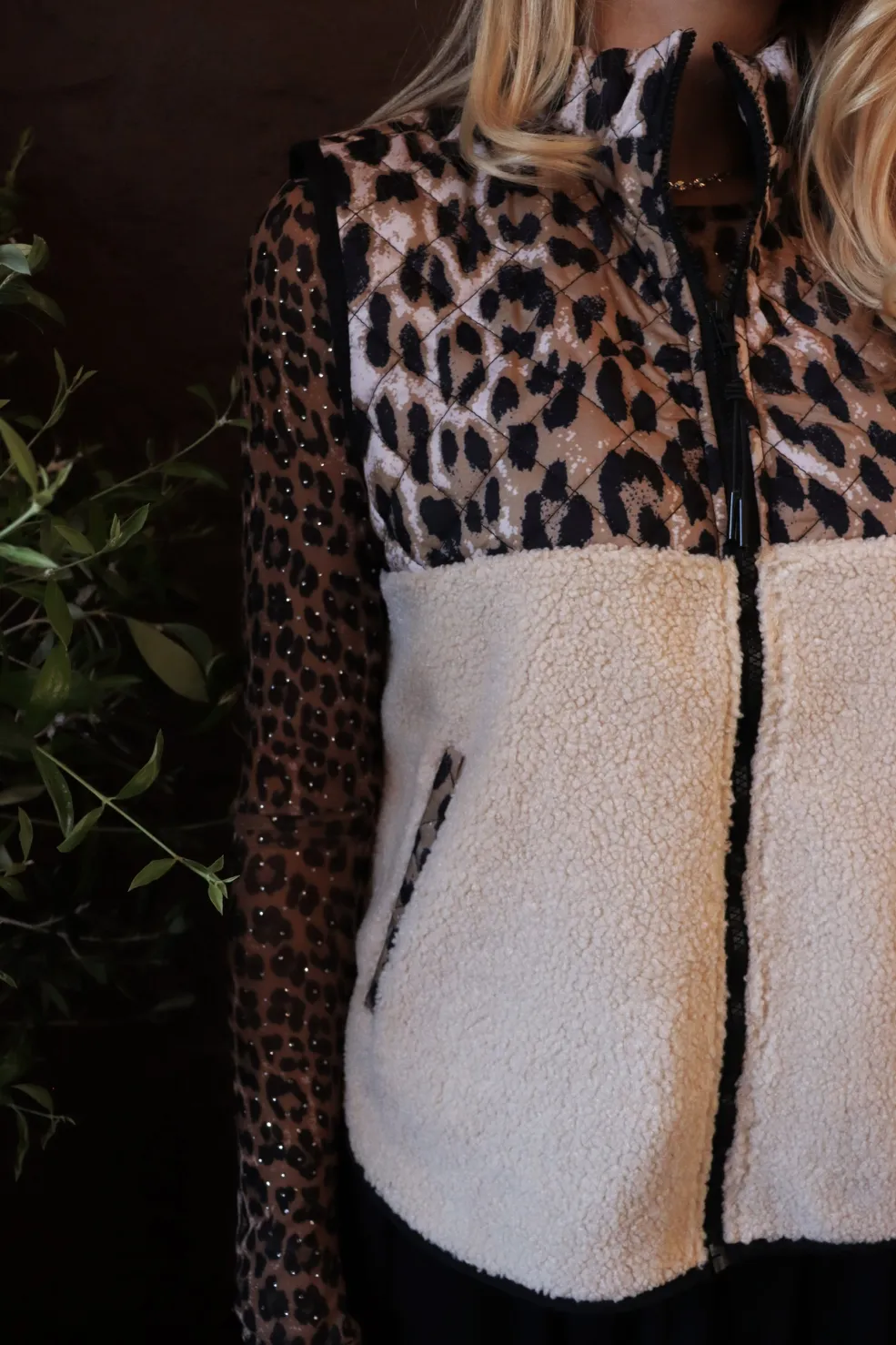 Ærmeløs teddyvest fra Liberte med leopardprint på overdelen og cremefarvet plysset materiale på den nederste del.