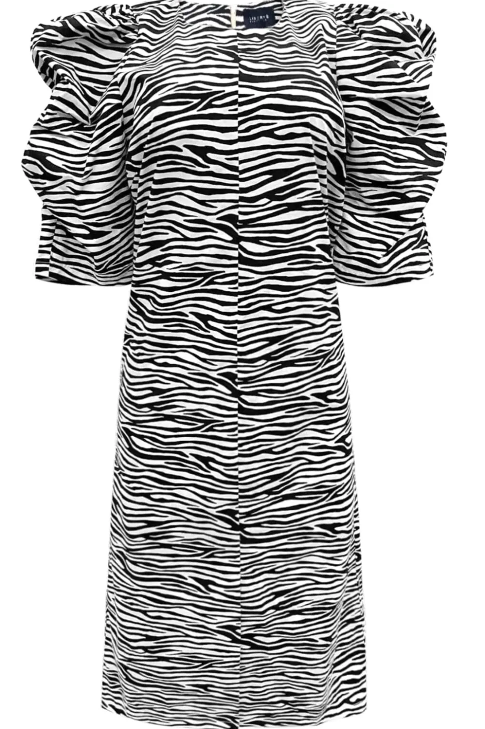 Kjole fra Liberte i sort og hvidt zebraprint med knaplukning foran. Den kalvelange kjole har puffede 3/4-ærmer og en rund halsudskæring.