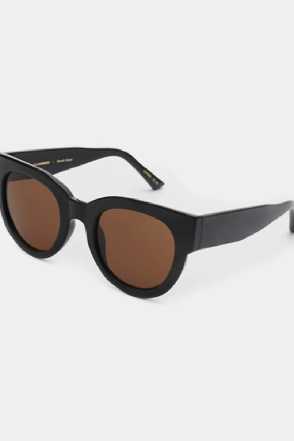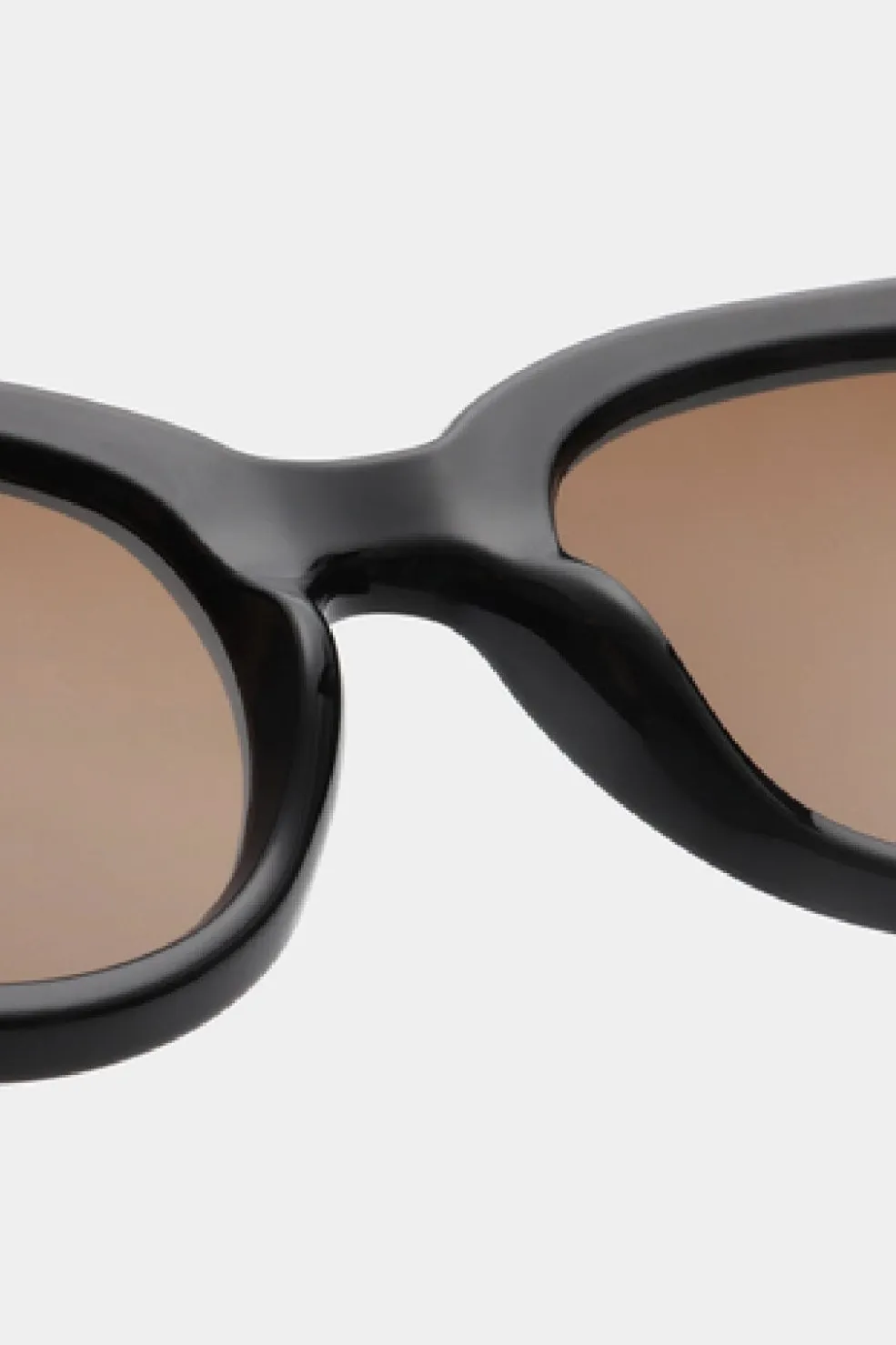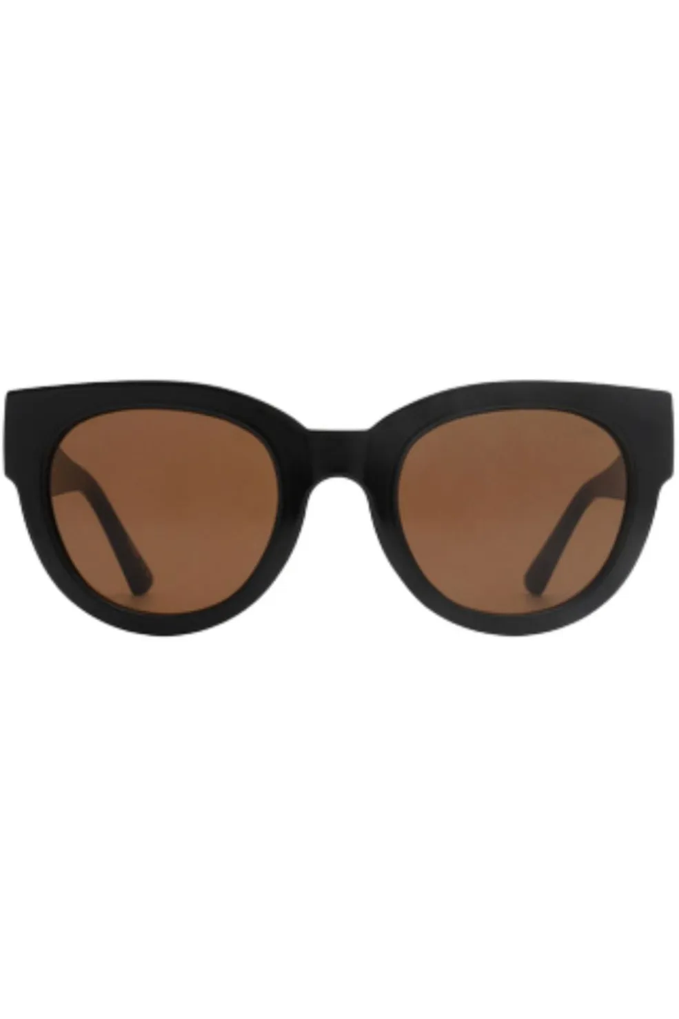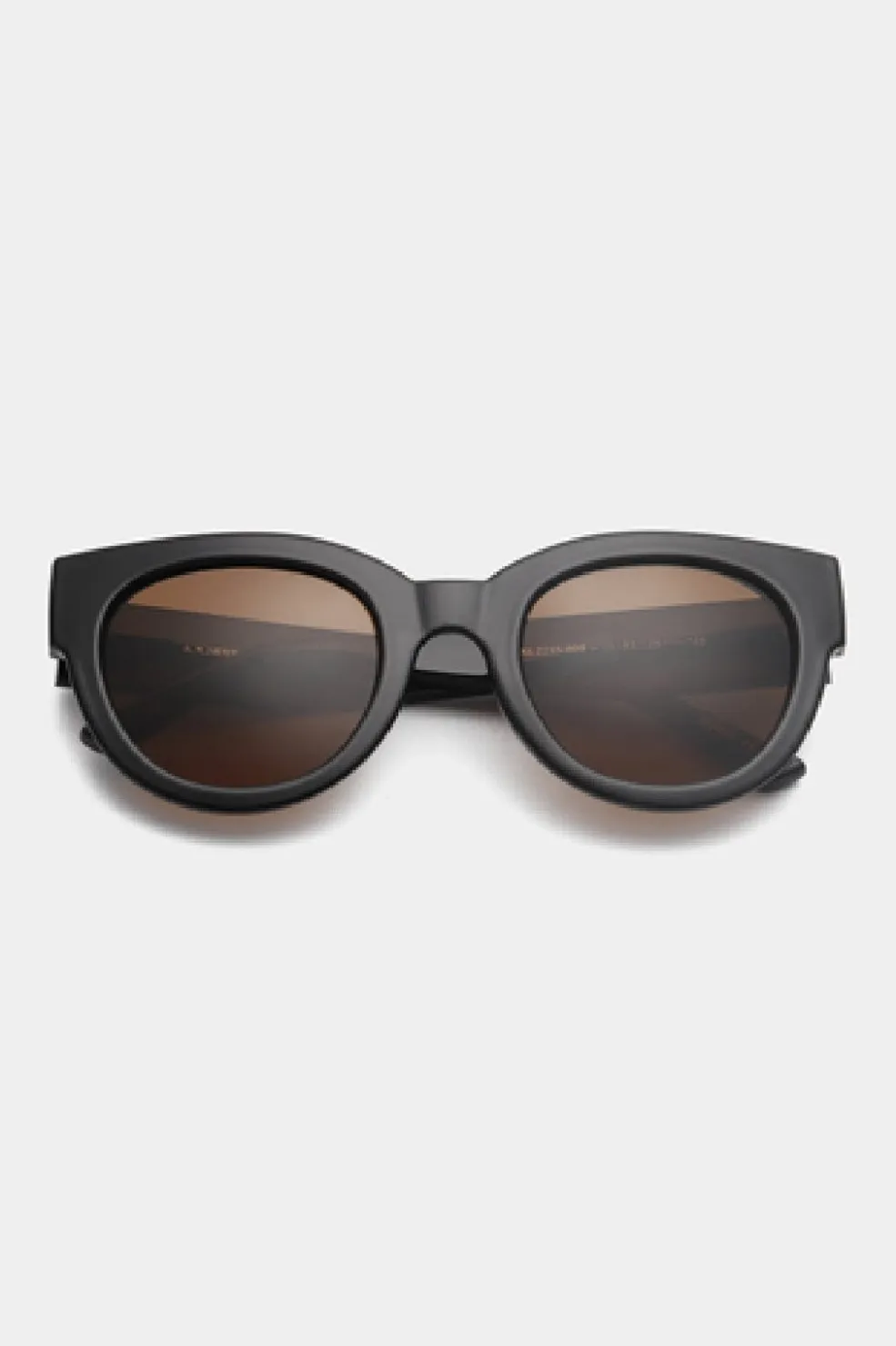 Sorte solbriller fra A. Kjærbede med overdimensioneret cat-eye-form og brune linser. Stellet er lavet af Tritan Renew med en markant bro mellem linserne.