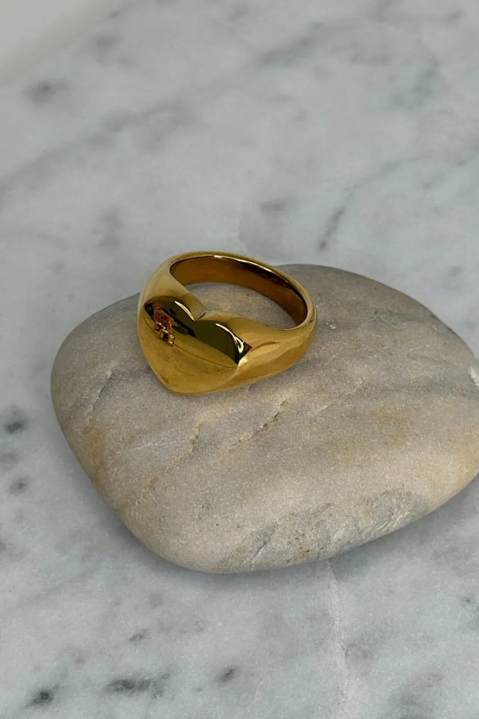 Forgyldt ring fra Mellow Moon med hjerteformet design. Ringen har en blank overflade og en poleret finish, der fremhæver det gyldne materiale og de rene linjer.