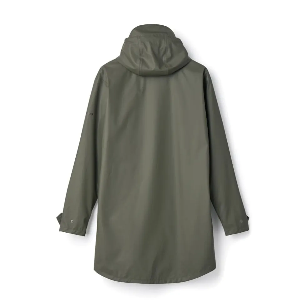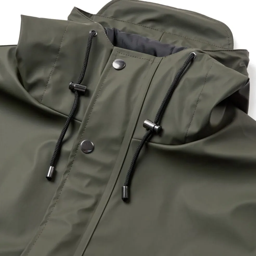 Armygrøn regnjakke fra H2O med svejsede sømme og høj vandtæthed. Jakken har en høj hals, justerbare ærmer og en fastmonteret hætte med snøre for ekstra beskyttelse mod regnen.