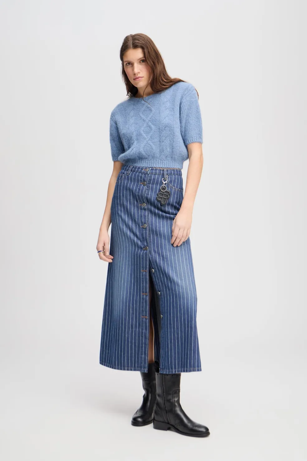 Indigo-nederdel fra Munthe i stribet denimstof med høj talje. Den har knaplukning foran og praktiske forlommer. Dekorative syninger giver nederdelen et rustikt præg.
