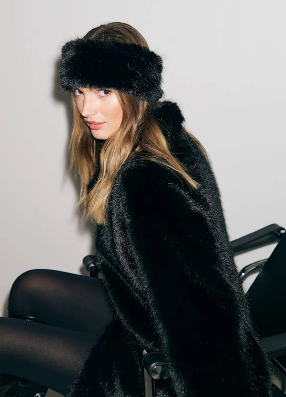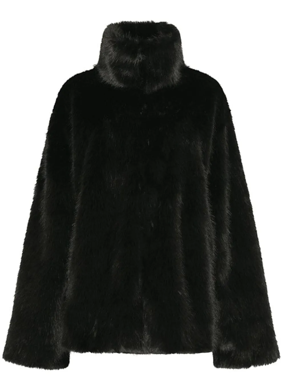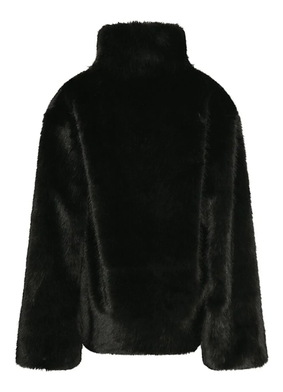 Sort jakke fra Noella, lavet af faux fur-materiale med en skinnende overflade. Jakken har en oversized pasform og en høj krave.