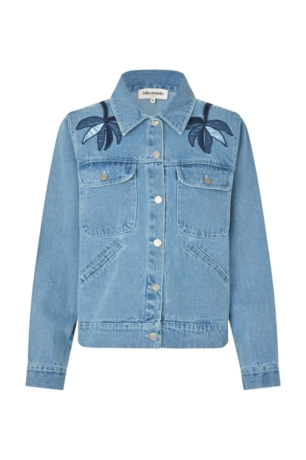 Denimjakke fra Lollys Laundry i vasket lyseblå denim med broderede detaljer. Jakken har broderede bladmotiver på skuldrene og et stort fuglemotiv på ryggen.