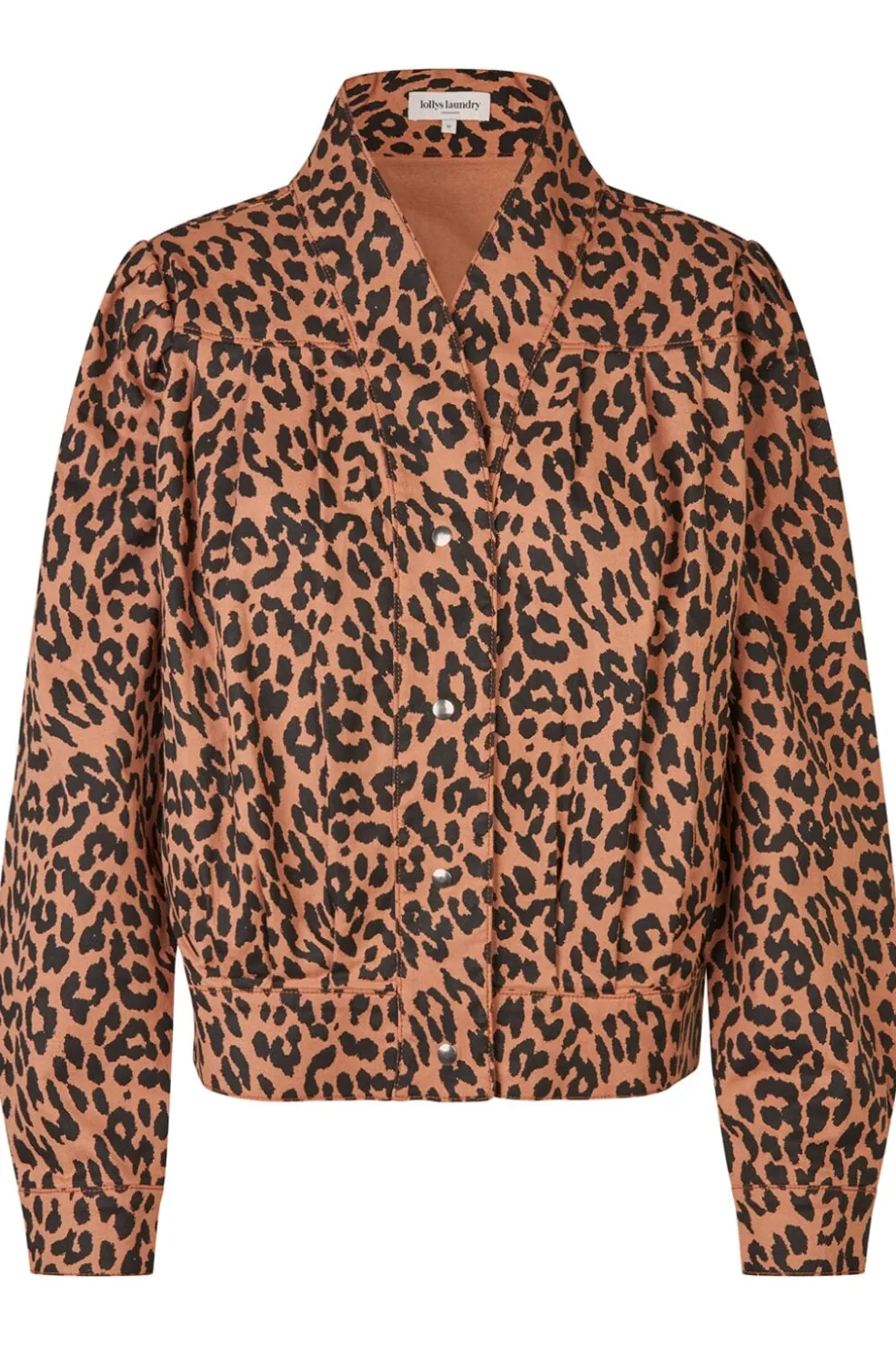 Jakke fra Lollys Laundry med leopardprint i brune og sorte nuancer. Designet har v-hals, trykknapper og pufærmer med flæsedetaljer, der skaber et blødt og feminint udtryk.
