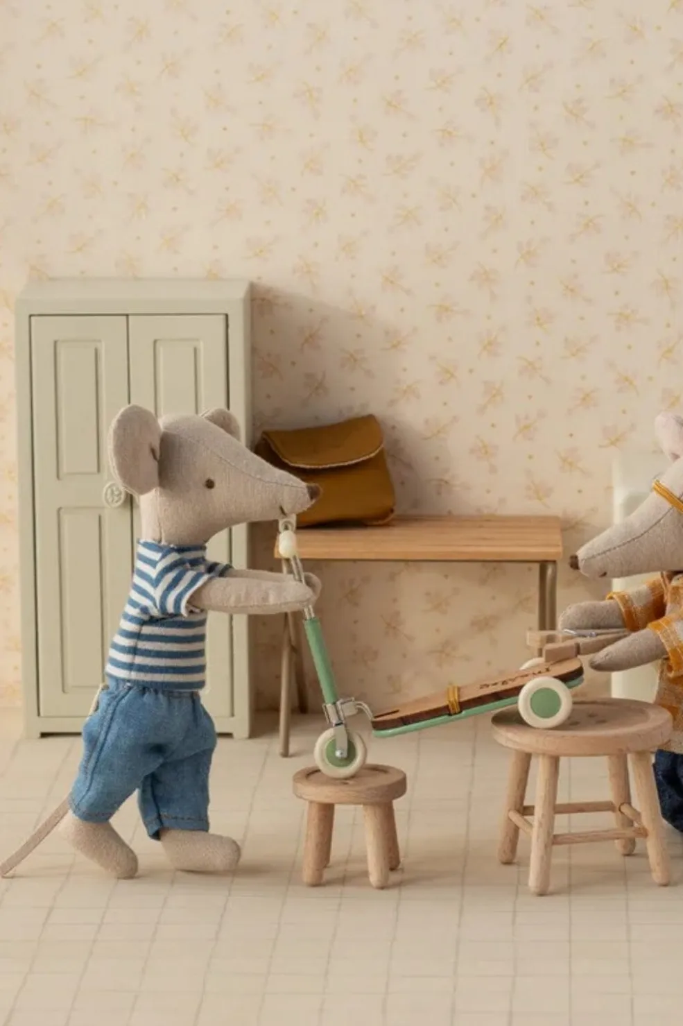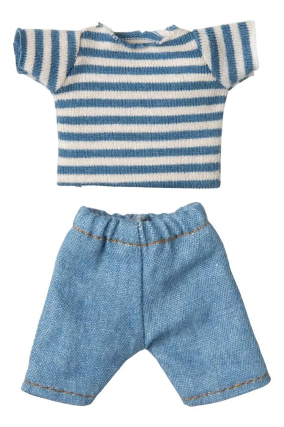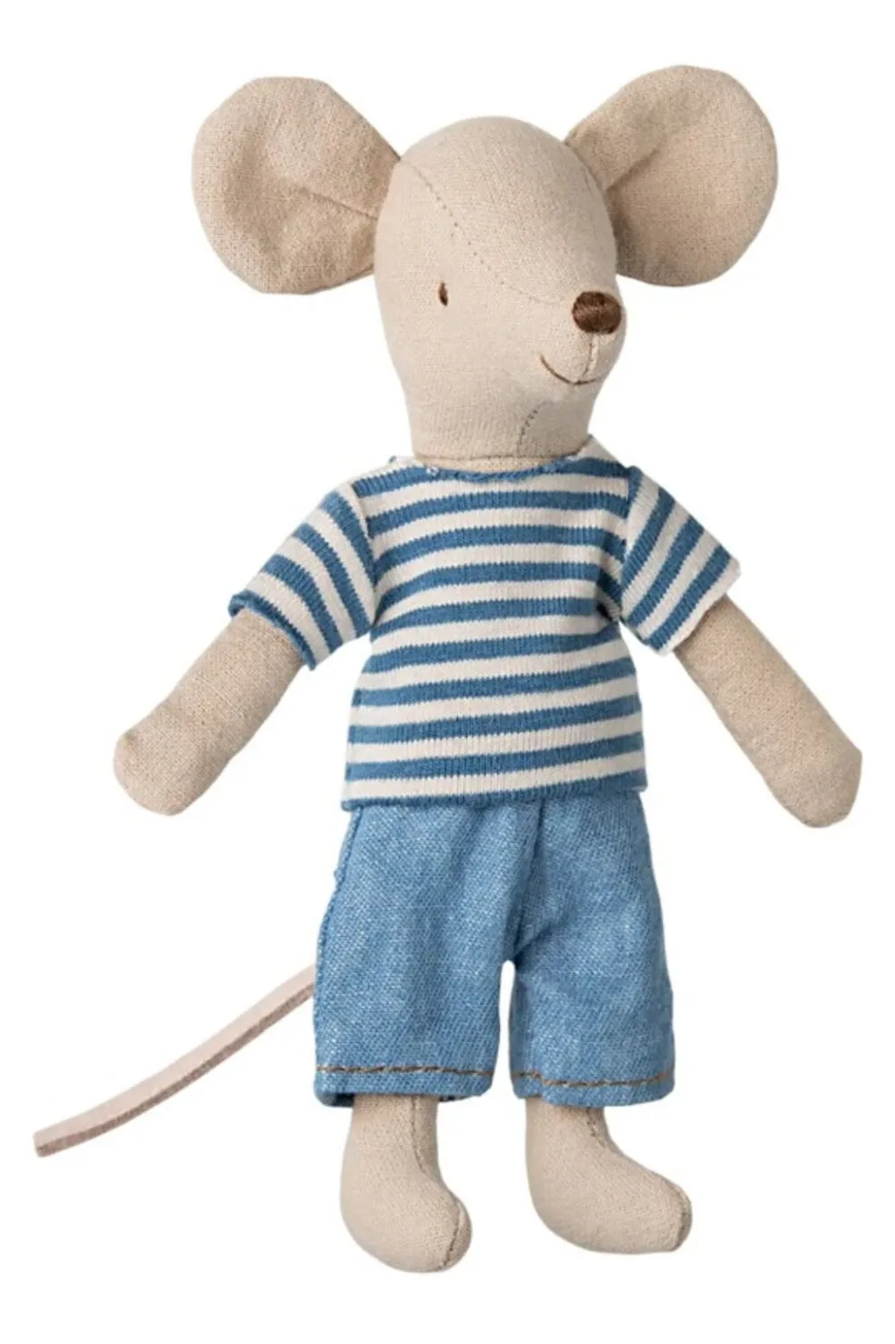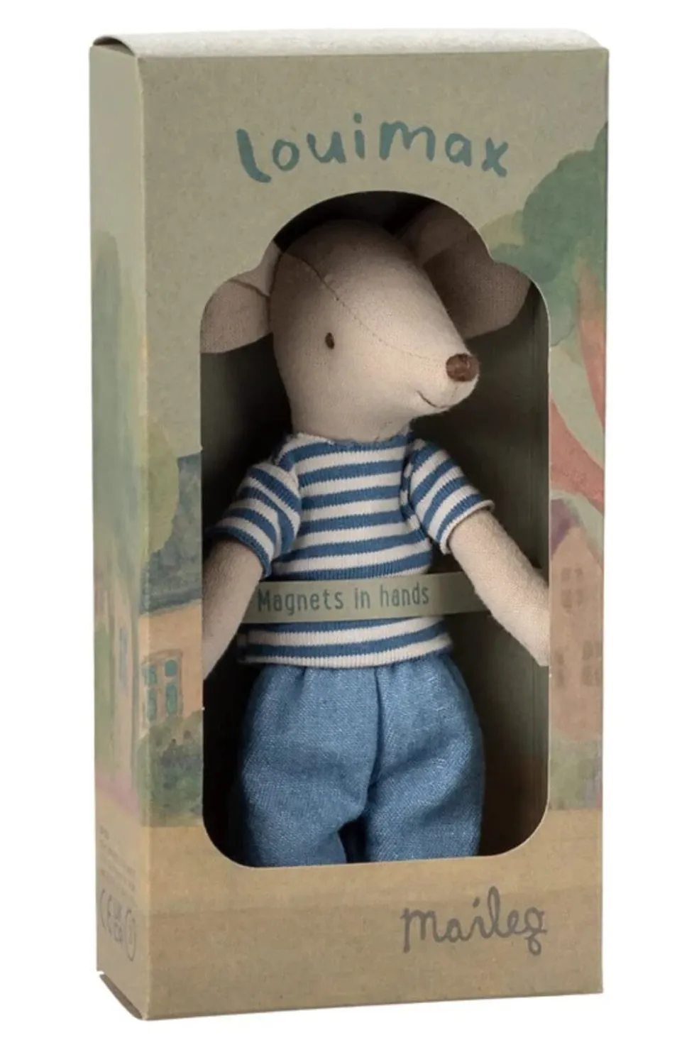 En blød stofmus fra Maileg med magneter i hænderne. Den kommer i en dekorativ æske og er klædt i en blåstribet t-shirt og denimbukser.