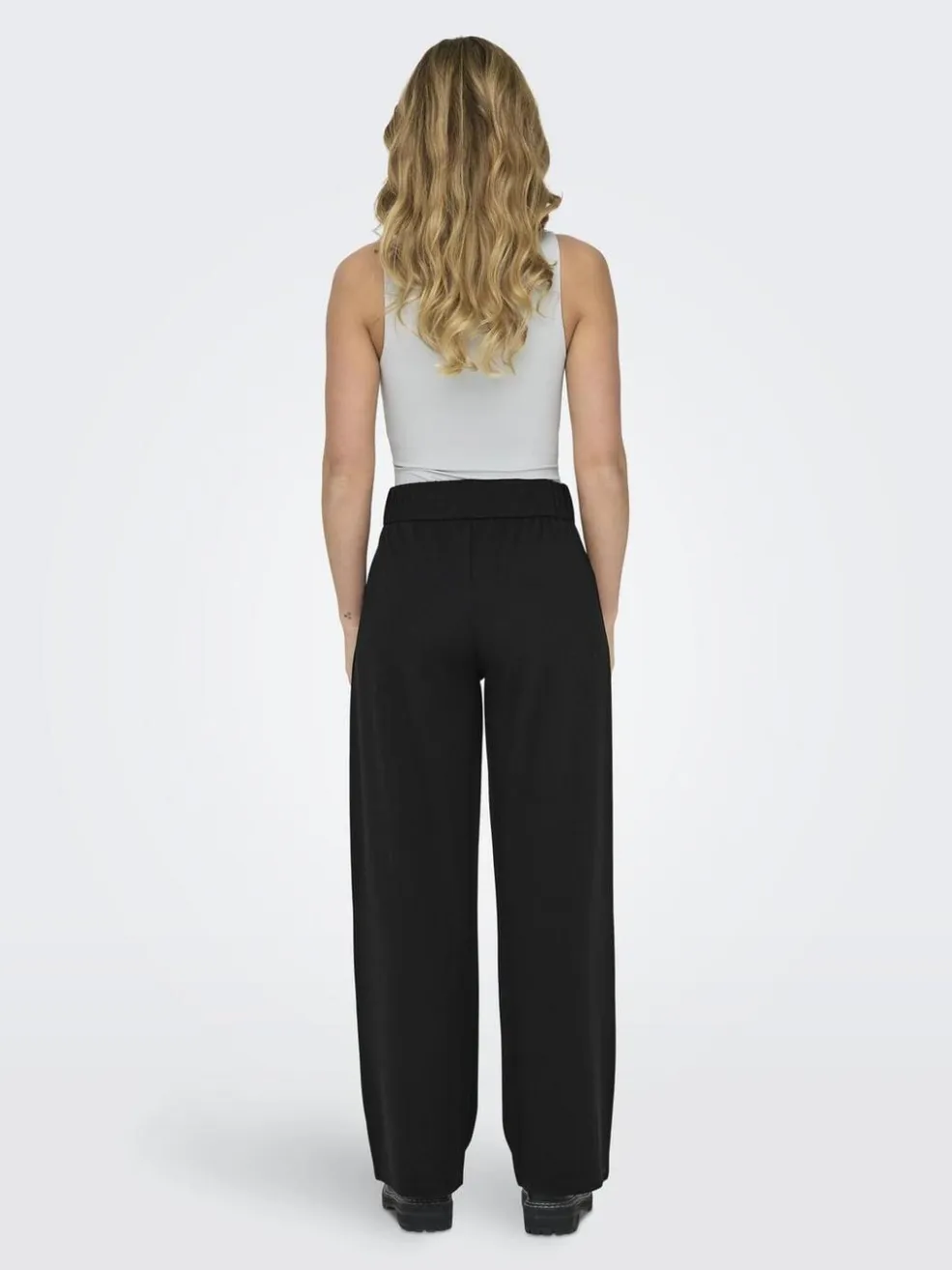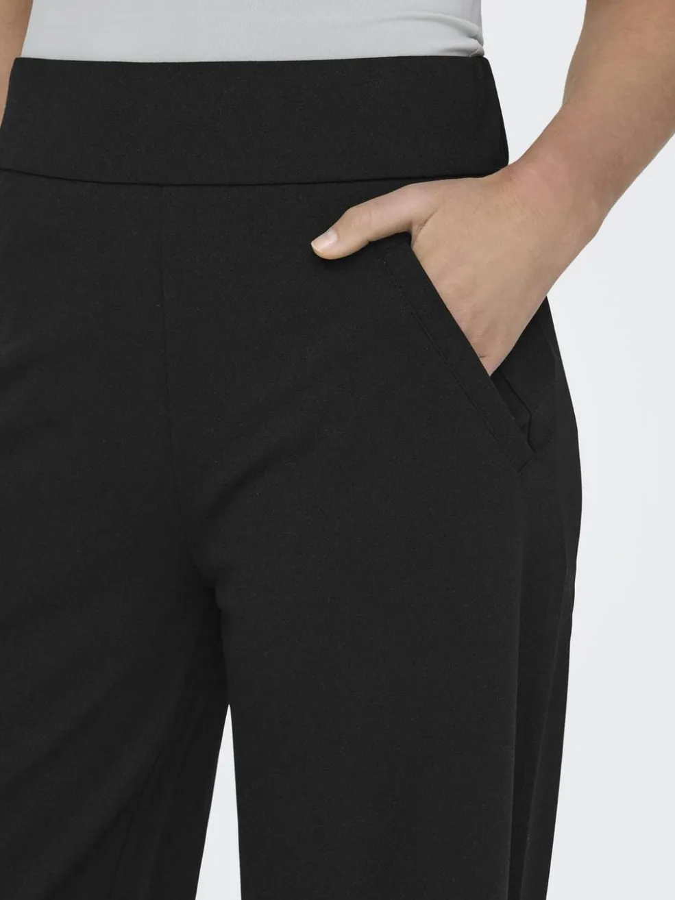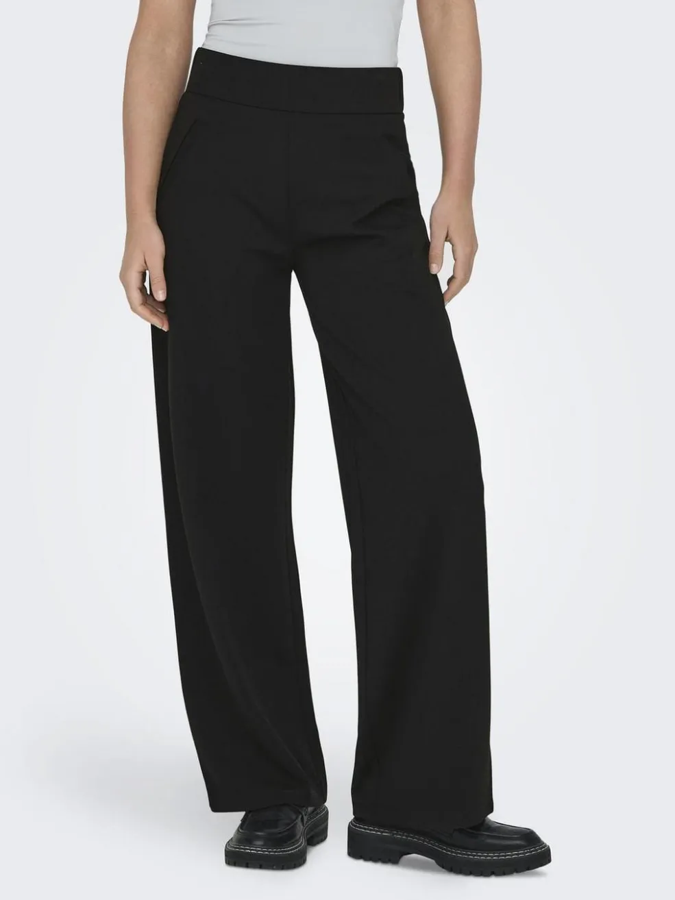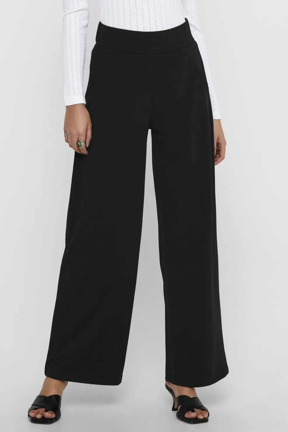 Sorte bukser fra JDY med høj talje og wide-leg snit. Bukserne har elastisk talje og sidelommer, og stoffet er en blanding af genanvendt polyester og elastan.