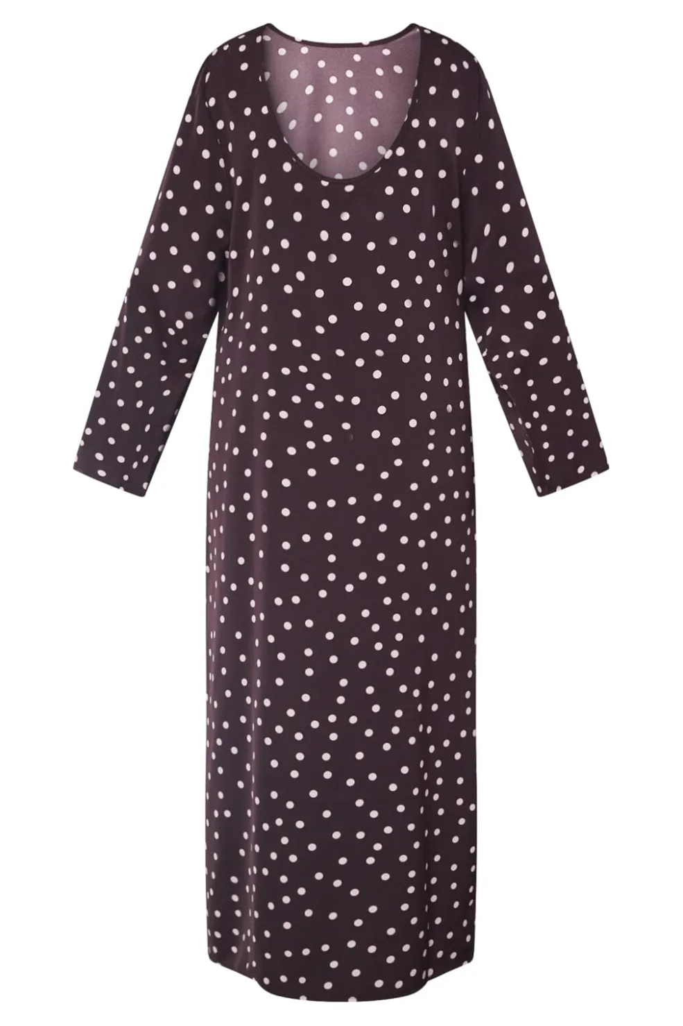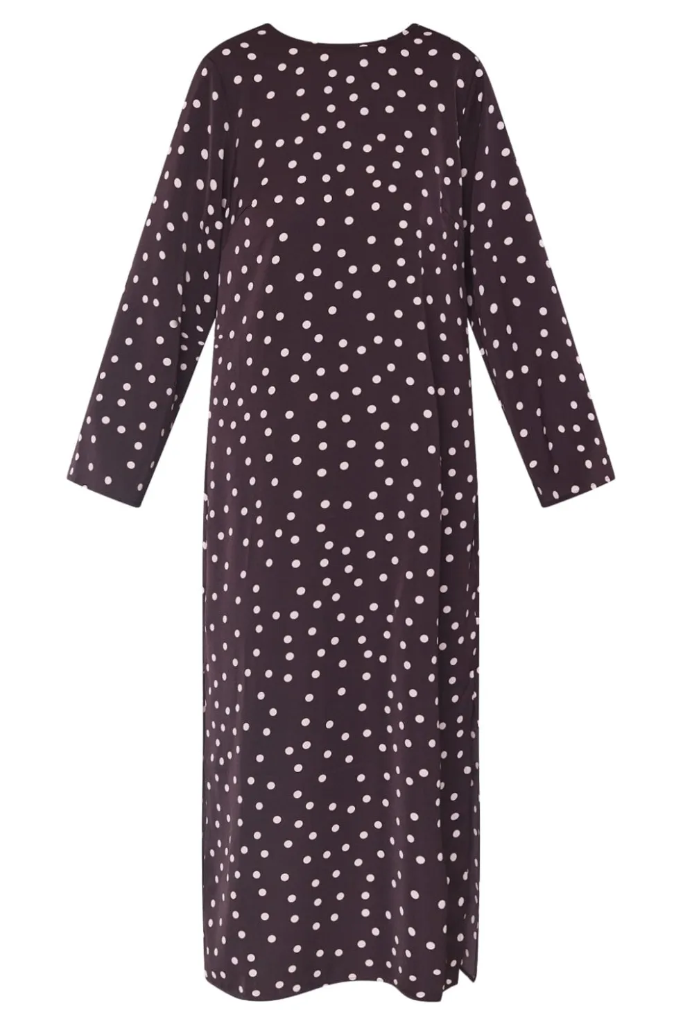 Langærmet kjole fra Love & Divine i bordeaux med lyse polkaprikker. Den lange kjole har en rund halsudskæring og en løs pasform med slids i siden.