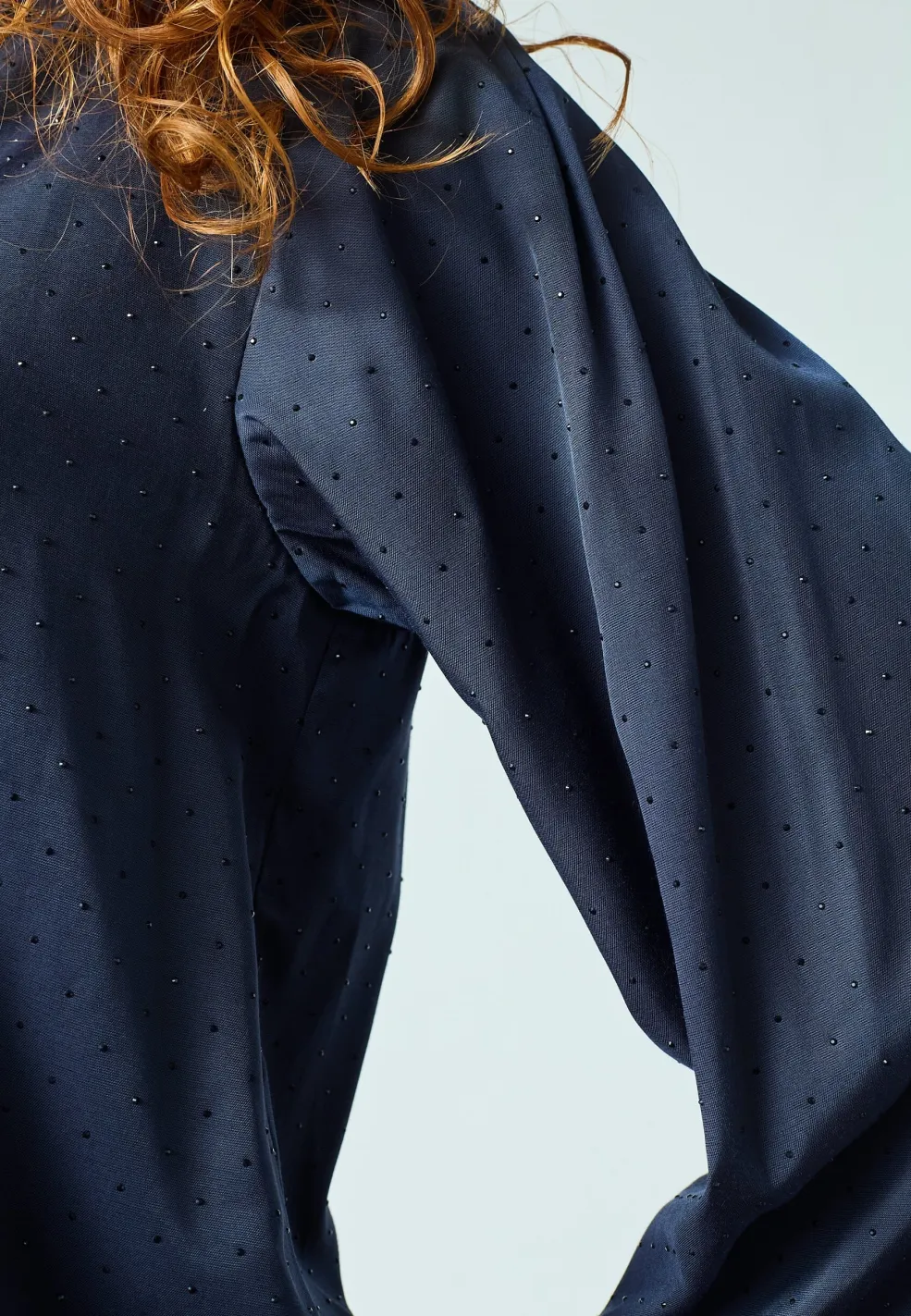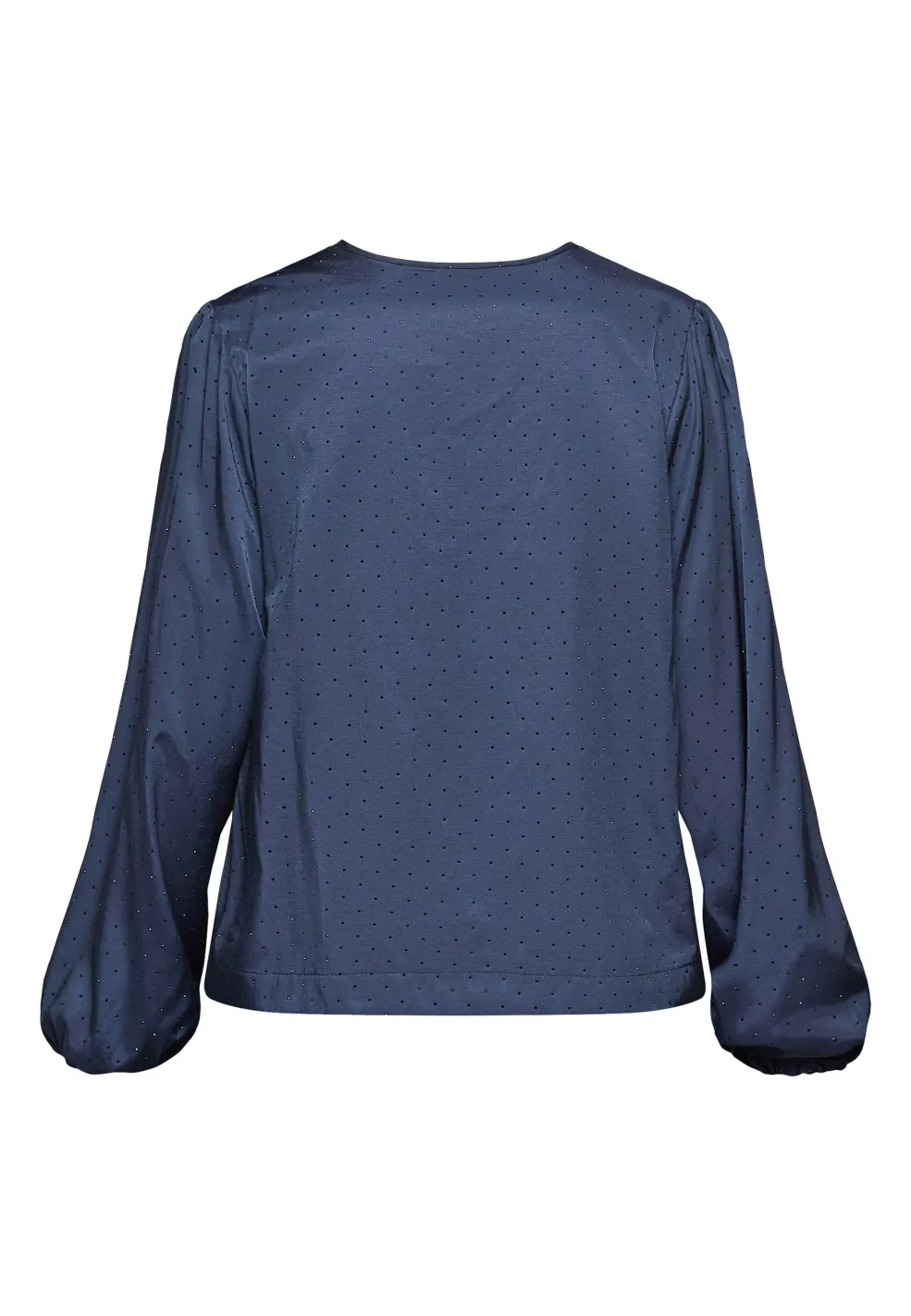 Mørkeblå bluse fra Love & Divine med diskret prikkemønster. Blusen har en V-hals og lange, voluminøse ærmer med elastiske manchetter.