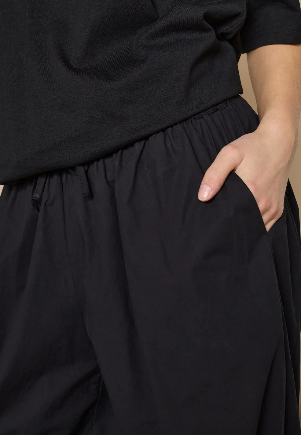 Sorte bukser fra Love & Divine, lavet af bomuld. Bukserne har et løstsiddende snit med brede ben og en elastisk talje med snor.