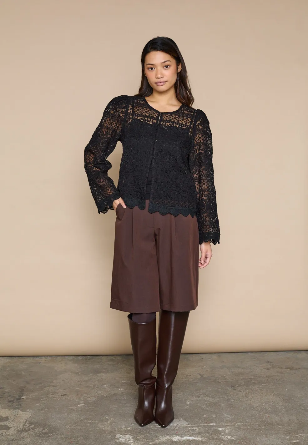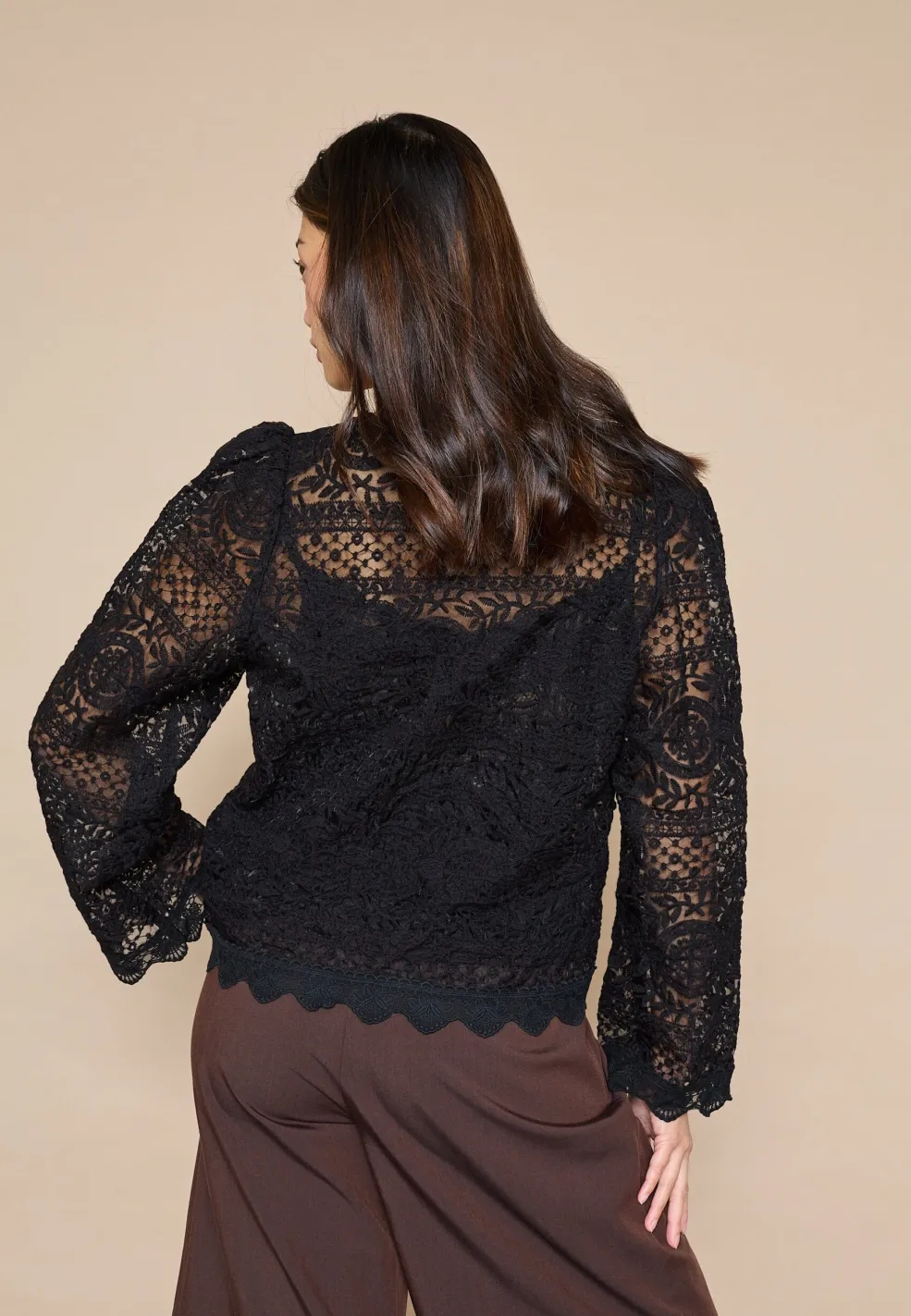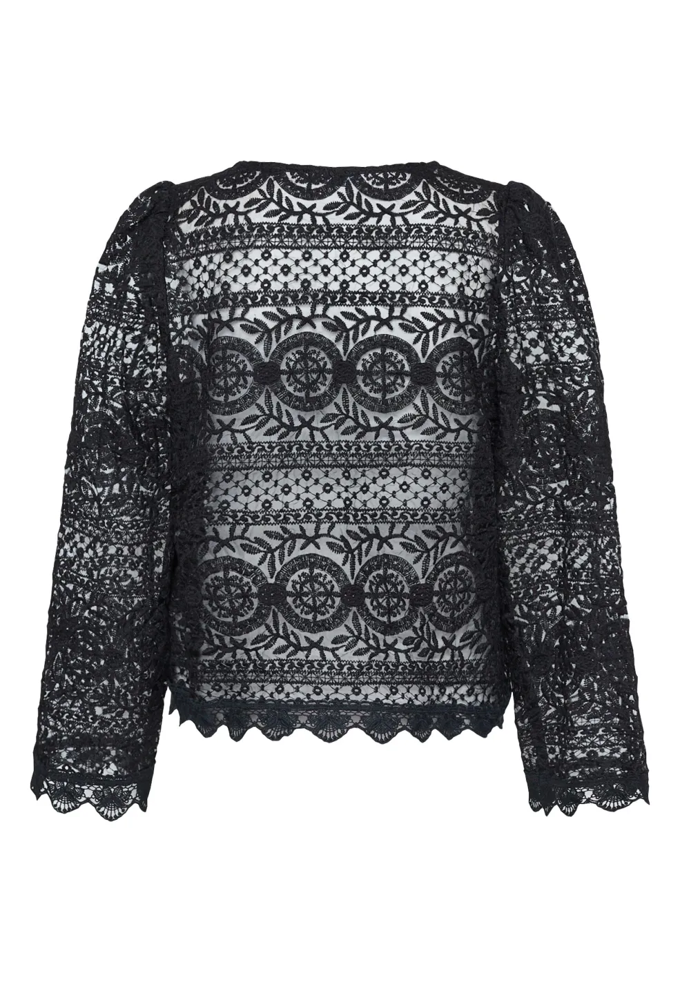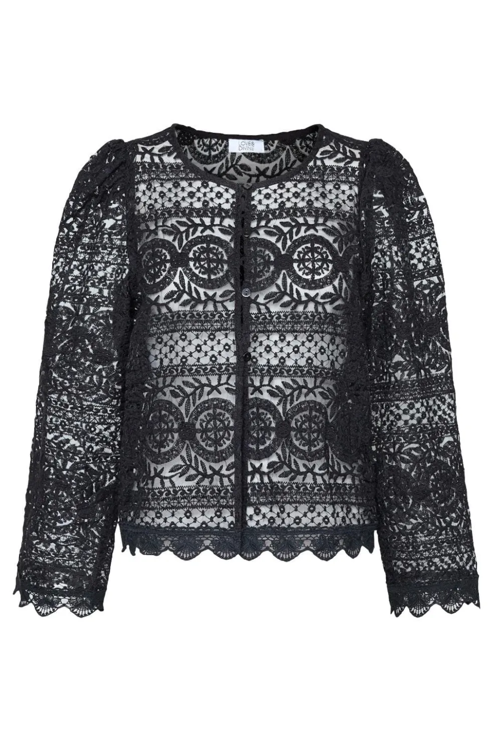 Sort bluse fra Love & Divine med blondemønster. Blusen har lange ærmer og knaplukning foran. Den passer til formelle og festlige lejligheder.